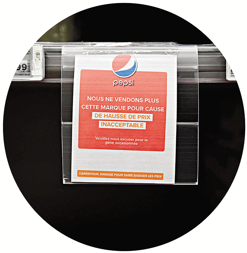 家樂福的發言人宣布,從周四開始,法國、意大利、西班牙和比利時家樂福門市的百事可樂等產品貨架上將貼出標示,稱「由於價格上漲令人無法接受」,該店將不再對這些品牌產品入貨,指出這些產品給家樂福帶來的成本太高。