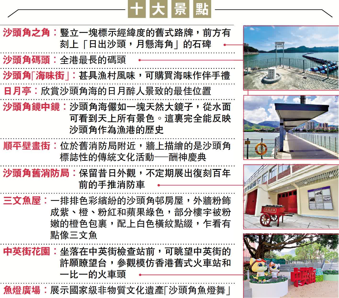 沙頭角最東之角豎立着一塊標示着經緯度的舊式路牌,前方還有刻上「日出沙頭,月懸海角」的石碑,相傳是源自一位清朝的大臣來到廣東沿岸視察,看見這裏風光如畫,便題下以上詩句,「沙頭角」因而得名。在這裏可盡覽沙頭角海灣的天然海岸線,靜下心神,觀賞香港最長的沙頭角碼頭。碼頭牆壁上,還有沙頭角小學生創作的壁畫。