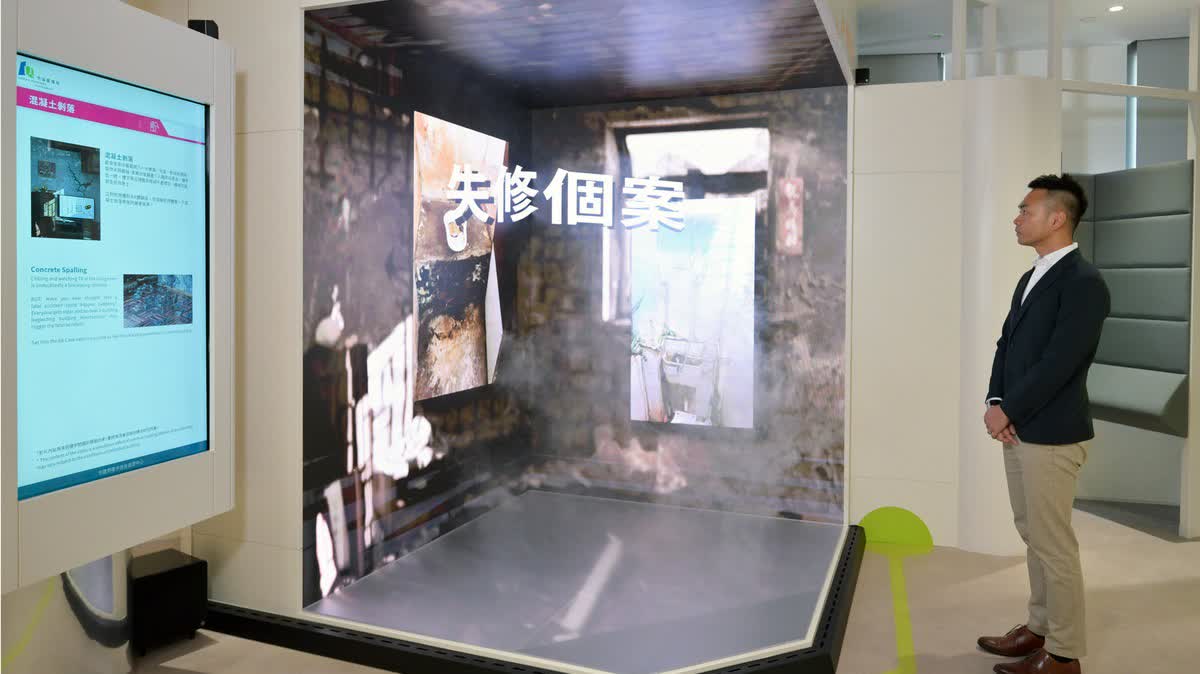 資源中心的亮點是四維多媒體大型屏幕,以立體影像方式模擬一幢樓宇日久失修,導致石屎剝落的場景,場面震撼,足以讓參觀者心生警惕。