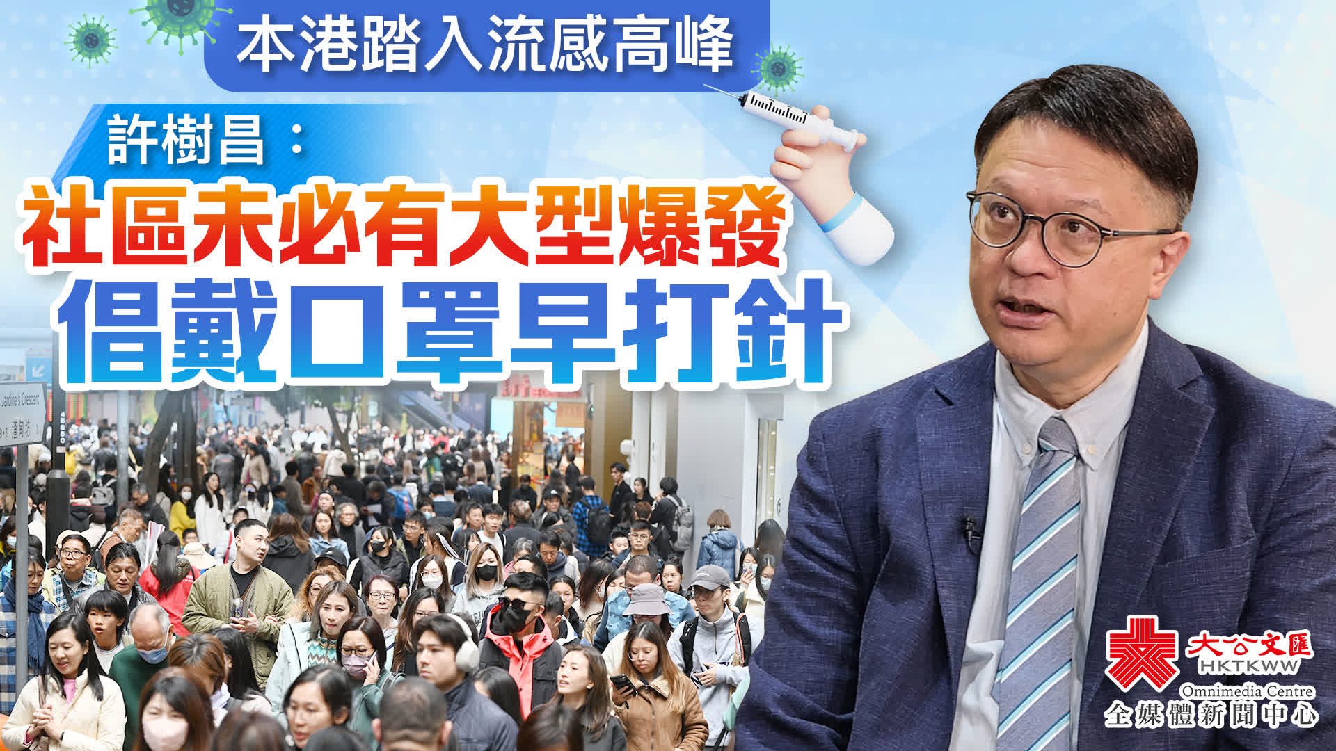許樹昌表示,目前流行的病毒H3N2主要針對長者,呼籲高危群組盡早接種疫苗,並建議市民在公共場所佩戴口罩。
