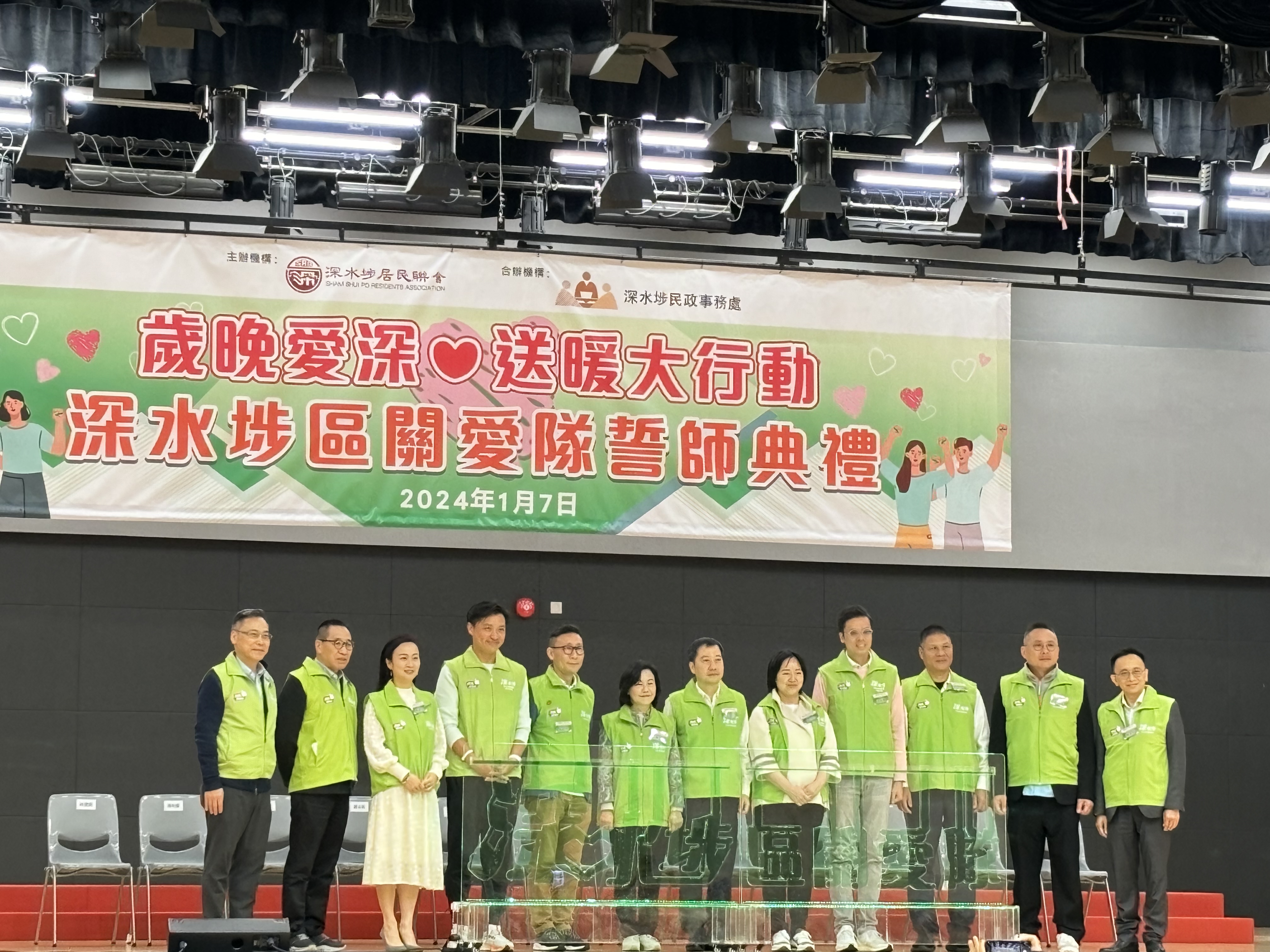 (大公文匯全媒體 記者 李九歌)關愛隊是特區政府完善地區治理下的重大舉措之一,深水埗區關愛隊日前已經投入運作,各小區關愛隊正積極策劃不同活動。深水埗區關愛隊誓師典禮於今日(7日)舉行,民政事務總署署長張趙凱渝、中央政府駐港聯絡辦九龍工作部副部長李文彬、深水埗民政事務專員兼深水埗區關愛隊總指揮黃昕然、港區全國人大代表文頴怡、立法會議員鄭泳舜、梁文廣、陳凱欣、全國政協委員兼深水埗關愛及社區發展基金黃少康主席等人作為主禮嘉賓出席典禮。