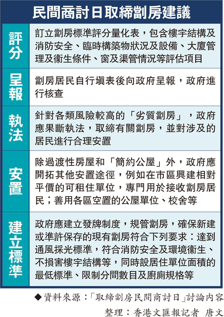 舉辦活動的兩關注團體表示,取締劏房必須有完善安置措施,除預留部分「簡約公屋」、過渡性房屋作安置用途外,亦建議參考過去取締寮屋,以及市建局的運作模式,在市區興建不少於一萬個可負擔的租住單位,同時善用各區的空置單位。團體認為難以靠政府單方面執法處理全港劏房,建議設租戶呈報機制,政府可製作一份容易理解的評分表,供租戶自行評估所處單位,主動呈報,再由政府派員作檢查,並配合頻密巡查。相關執法人員須具備足夠的搜證權力,避免有法不依,搜證困難進而不了了之的情況。