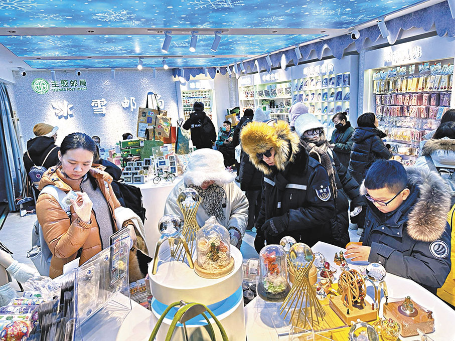 冰雪大世界的主題郵局裝潢冰雪韻味十足,吸引眾多遊客打卡拍照。五百餘款文創產品,從冰箱貼、建築模型、音樂盒、紙膠帶到郵政形象盲盒、托特包、保溫杯等品類繁多,每天能接待萬餘名遊客,把哈爾濱的冰雪文化帶回家。
