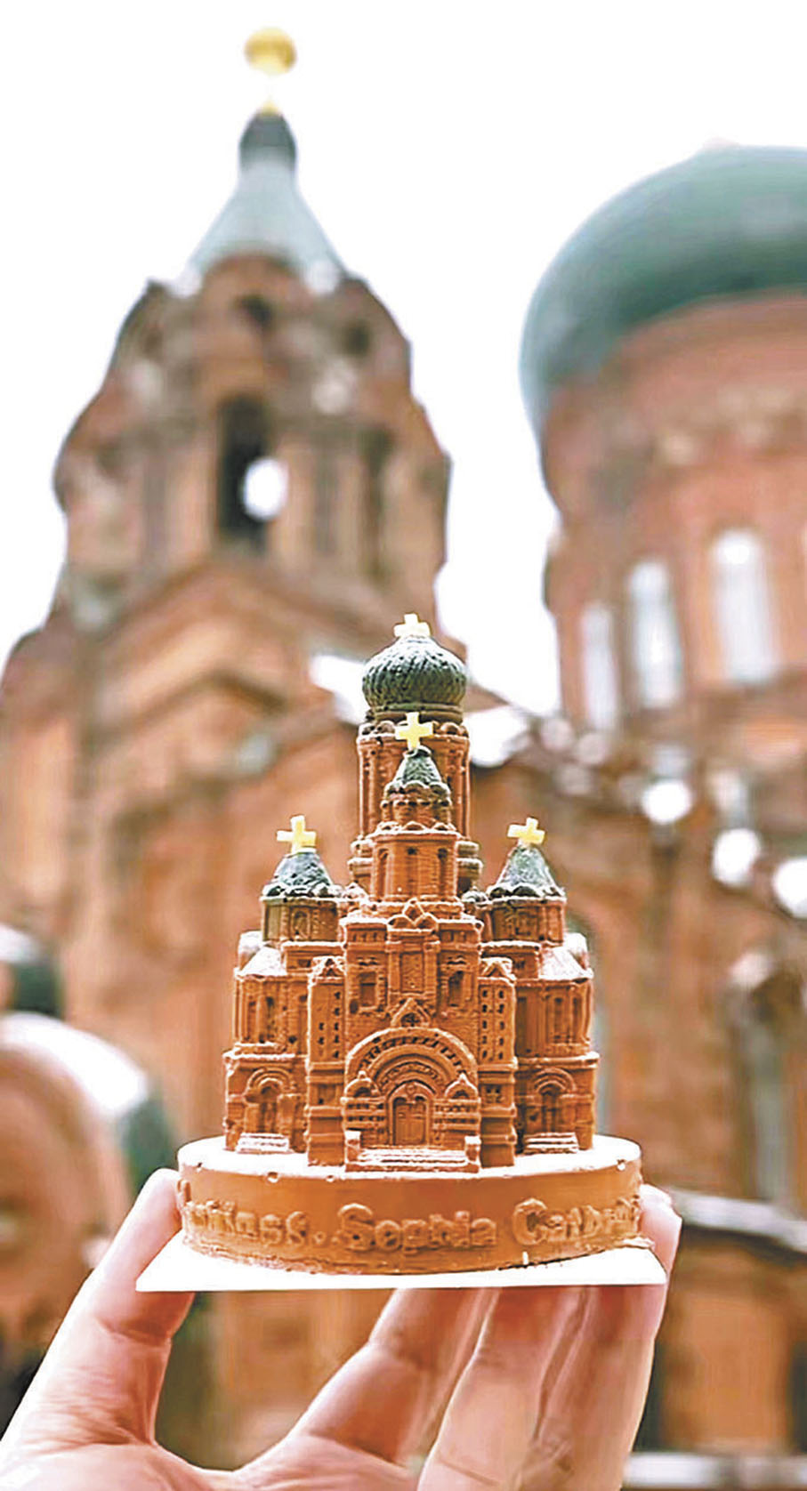 櫥窗裏陳列的一排排「索菲亞慕斯」小蛋糕上,幾乎一比一還原教堂本體,巧克力色的蛋糕主體上,四個墨綠色的「洋葱頭」頂還有金黃色的十字架標誌。主體「建築」上,拱門、窗戶位置的鏤刻細節精緻,店家還猶如神來之筆般地撒上細細潔白的糖霜,模擬雪後的教堂。