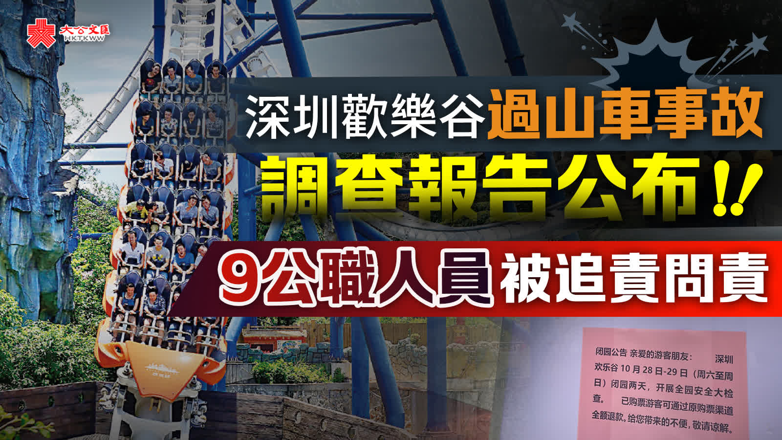 大公文匯全媒體報道,2023年10月27日,深圳市南山區沙河街道歡樂谷景區內大型遊樂設施「雪域雄鷹」彈射過山車發生碰撞事故,造成28人入院就診,其中3人重傷、7人輕傷、11人輕微傷、7人未達輕微傷,直接經濟損失397.50萬元人民幣。據廉潔深圳網消息,經批准,深圳市紀委監委日前對深圳市歡樂谷「10·27」一般生產安全責任事故開展問責調查。