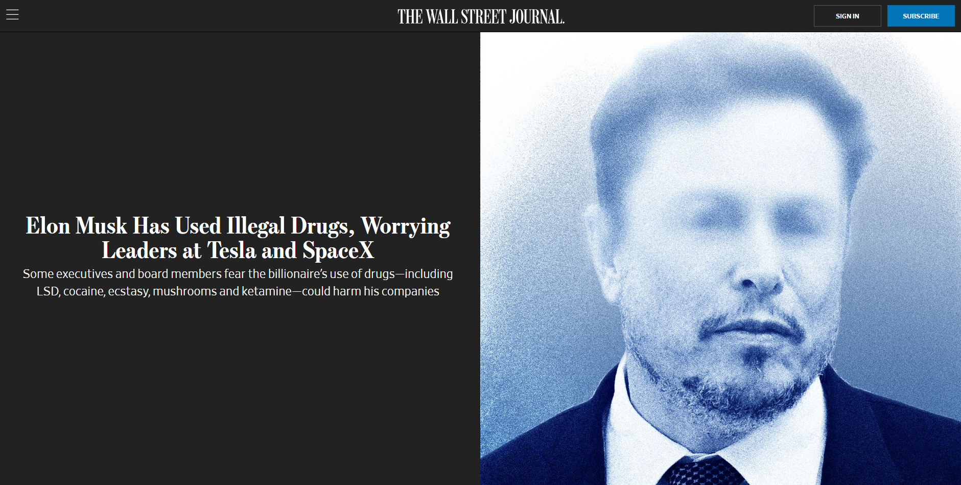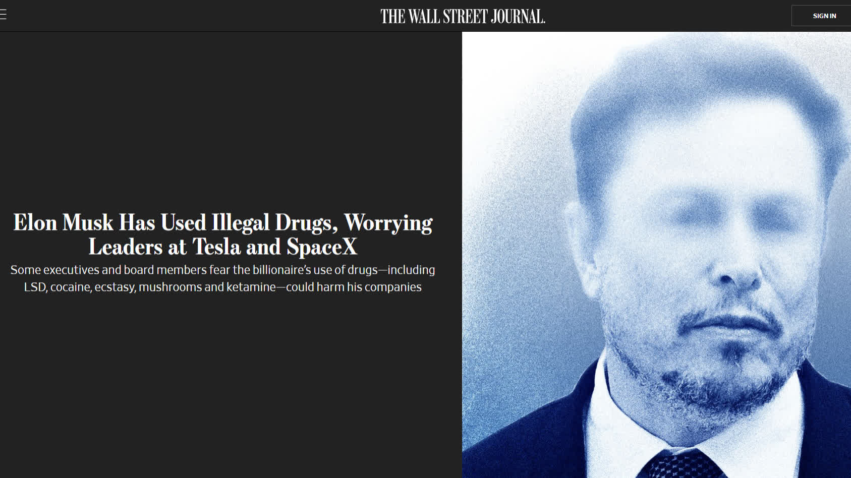 《華爾街日報》稱,據目睹馬斯克吸毒的人和其他知情人士的說法,馬斯克經常在世界各地的私人聚會上吸食可卡因、搖頭丸等藥物,參加者要簽署保密協議或交出手機才能入場。報道稱,馬斯克此前曾在公開場合和喬·羅根(Joe Rogan)吸食大麻。而非法使用毒品很可能違反美國聯邦規定,這可能危及SpaceX與美國政府數十億美元的合同。