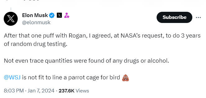 馬斯克本人昨日(7日)發文回應,指在與羅根吸了一口之後,他同意應NASA的要求進行為期3年的隨機藥物測試,「甚至沒有發現任何微量的毒品或酒精」。