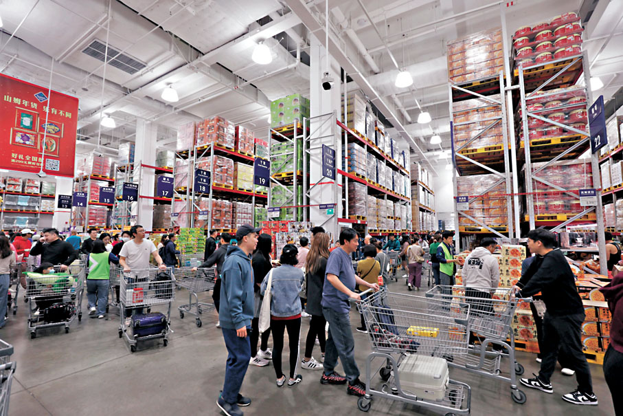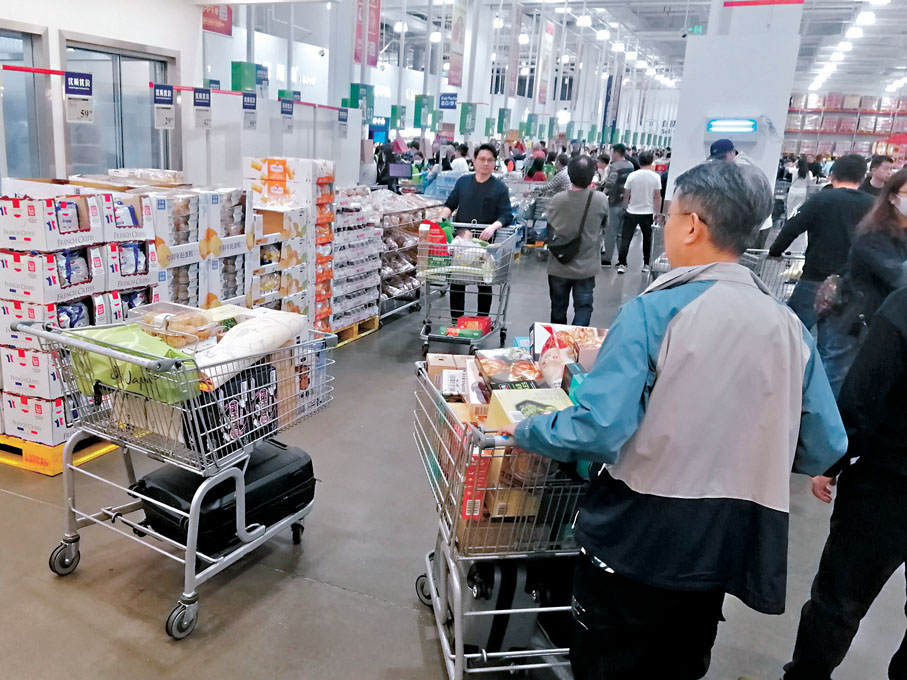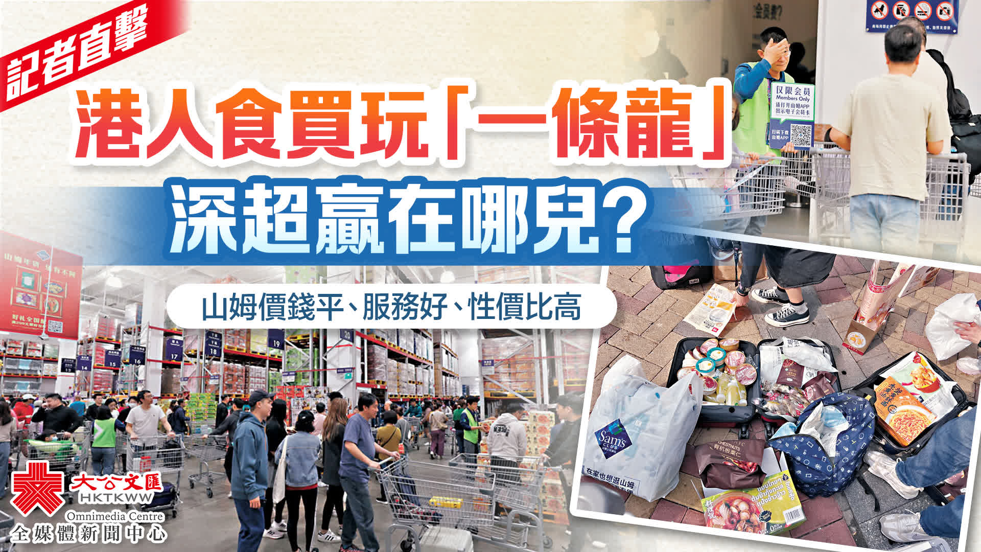 (香港文匯報專題組)香港與內地恢復正常通關滿一年,北上消費潮愈吹愈熾熱。倉儲式超市「山姆店」火爆之際,深圳本周六更將有另一間大型連鎖超市Costco開幕,勢必成為港人另一消費熱點。到底這股熱潮背後,反映香港零售業哪些不夠吸引的痛點?香港文匯報記者在剛過去的周日(7日)直擊「山姆店」港人瘋狂掃貨盛況,現場幾乎六七成客人是香港人,到處聽到廣東話,有人一行6人總共購買4,000多元人民幣的食品、日用品等,大呼過癮,即場瓜分「戰利品」。他們表示,性價比高無疑是深圳優勝之處,但此外更重要的是內地貨品多元化,由於內地市場大,一些冷門產品在內地也有生存空間,而且購物體驗富新鮮感,這都是香港消費所缺乏的。業界認為,兩地融合是大勢所趨,北上消費是必然結果,香港零售業必須繼續強化自身國際化的優勢,吸納來自各地的旅客。