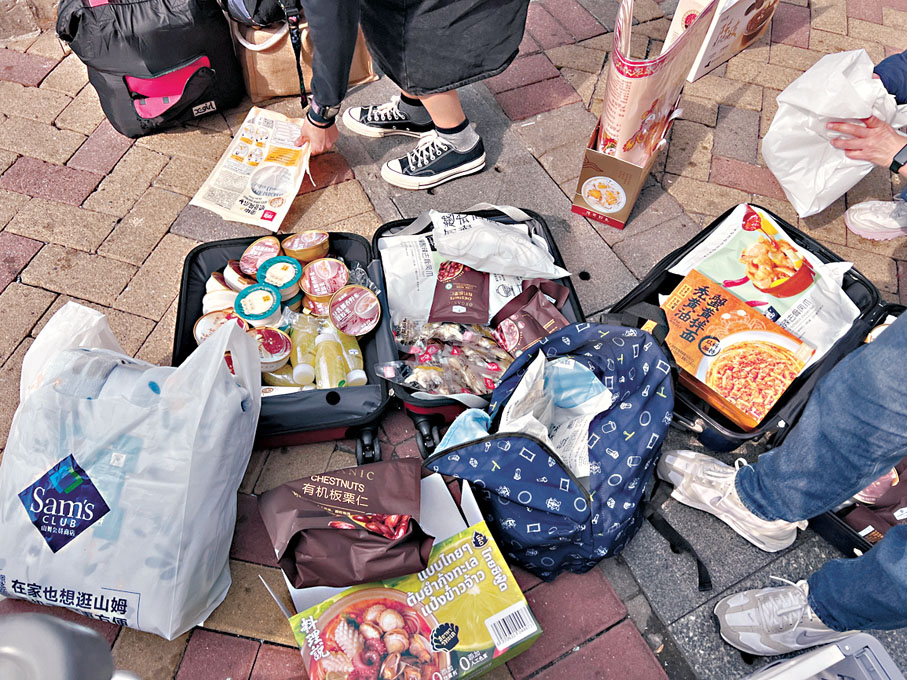 不少港人滿載而歸,其中一位港人Tony嬸正與幾名友人在地上打開行李箱瓜分「戰利品」。她興奮地向記者介紹今次的收穫,「你看這些糖水細細份,一個人食剛剛好,香港幾十蚊買一碗又食唔曬,浪費食物,內地產品就人性化好多。另外我買咗一大包泡椒鳳爪,同親友一起分,曾經有朋友推介這款食品,試過覺得好味,自己再來買!」