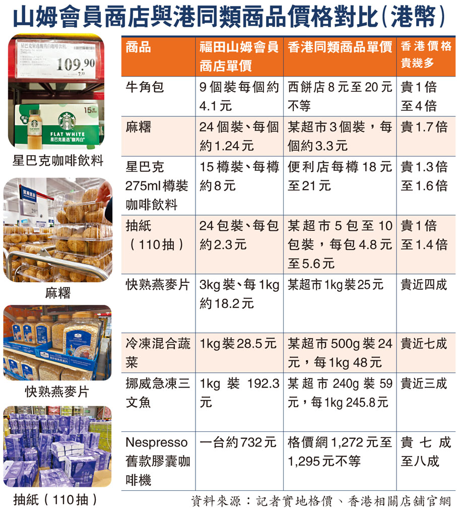 香港文匯報記者在深圳福田山姆會員商店進行格價,發現該店不少貨品單次銷售貨量大,例如一買就一打產品,或十公斤貨量等,分攤的單價相對低廉。同類商品在香港的單件零售價,大部分比山姆貴一倍以上,例如最搶手的牛角包,平均每個只需4.1元人民幣,每次最少買9個。此外,部分小型電器訂價比香港低三分之一或以上,售價雖然較低,但卻是舊款,在香港官方商店已無法購買,只能透過代理商店購買。例如一款Nespresso膠囊咖啡機,山姆只售732元港元,較香港平超過500港元,但已是數年前的舊款。