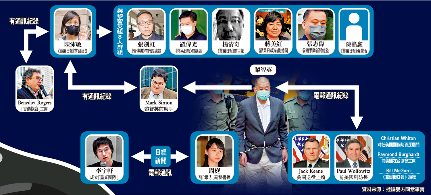 承認事實亦包括,警方在拘捕黎智英後,發現其手機中有與多名具影響力美國政要的電郵通訊記錄,包括前美國國防部副部長Paul Wolfowitz、美國退役上將Jack Keane、時任美國國務院資深顧問Christian Whiton及前美國在台協會主席Raymond Burghardt,以及《華爾街日報》編輯Bill McGurn等。