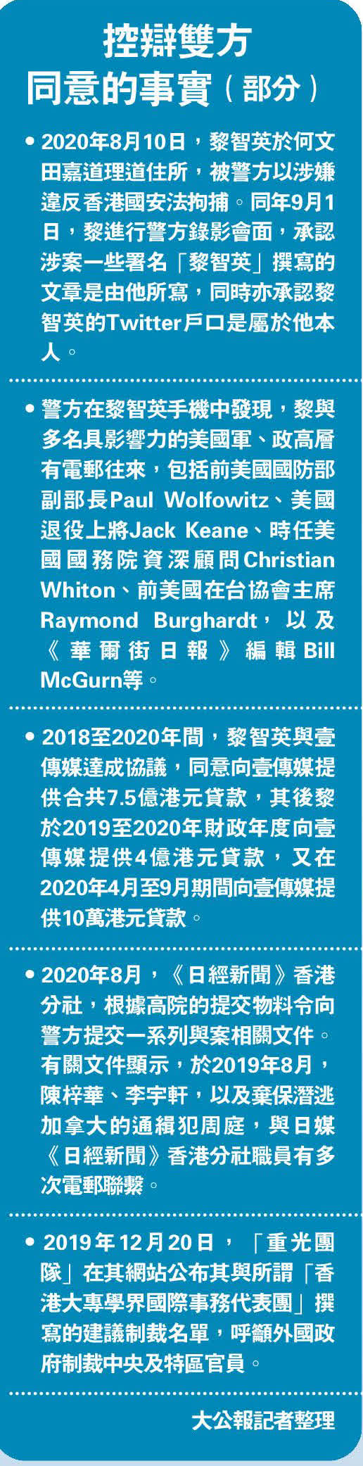 承認事實包括黎與美國軍、政高層保持聯繫,包括前美國國防部副部長、美國退役上將、時任美國國務院資深顧問和《華爾街日報》編輯等。此外,黎多次向壹傳媒注資,包括曾在黑暴期間向壹傳媒注資4億。案件今日續審,辯方代表彭耀鴻因突發私人理由將缺席聆訊兩星期,預期法庭將應辯方要求,連續多日播放涉案影片。