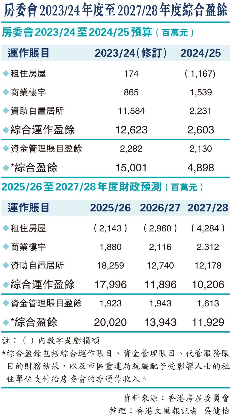 至於資助自置居所,經修訂後,2023/24年度房委會預計將有約115億元收入淨額,但預計2024/25年度各項資助自置居所運作賬目的淨收入為22.31億元,較2023/24年度的收入為少,主要由於預期完成轉讓契據的資助出售單位數量較少,由8,200個下降至1,400個。