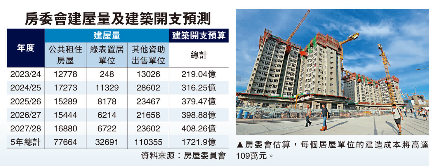 根據房委會的建屋計劃,房委會在2023/24至2027/28年間,需要興建約11萬個公營房屋單位,相當於《長遠房屋策略》十年公營房屋供應目標的三分之一。房委會表示,由於房屋產量以及建築工程價格上升,令建築支出持續上升,預計下兩個年度建築支出將會超過300億元,而2026/27和2027/28年度更會上升至每年約400億元,未來5年建築開支將高達1721.9億元。
