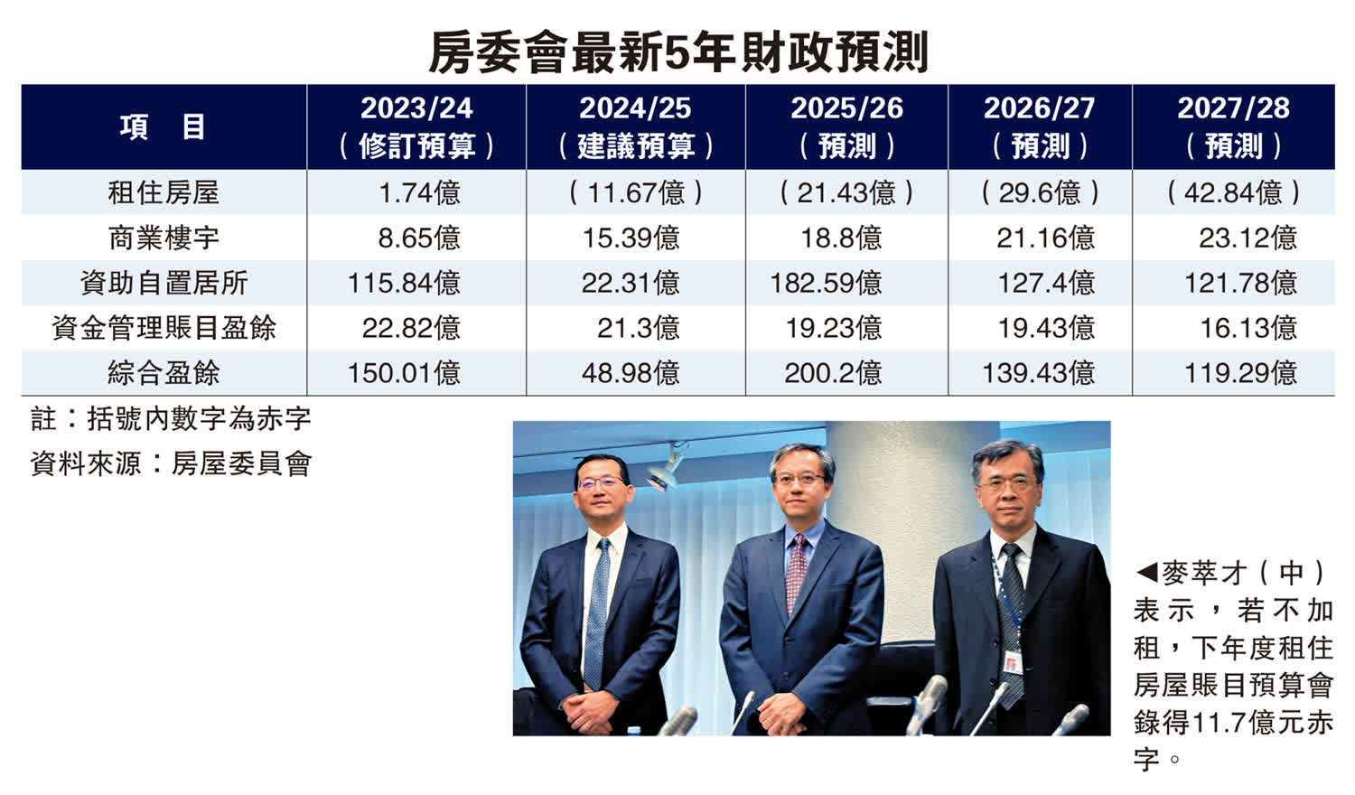 在公屋營運方面,2023/24年度修訂預算預期錄得1.74億元的小額盈餘,而原來預算有4600萬元虧損。房委會財務小組委員會主席麥萃才解釋,是由於日常維修及改善工程、清潔及保安服務等經常開支減少,但預期若不加公屋租金,下年度的營運將會虧損11.67億元,虧損情況亦會連年遞增,至2027/28年度蝕42.84億元。