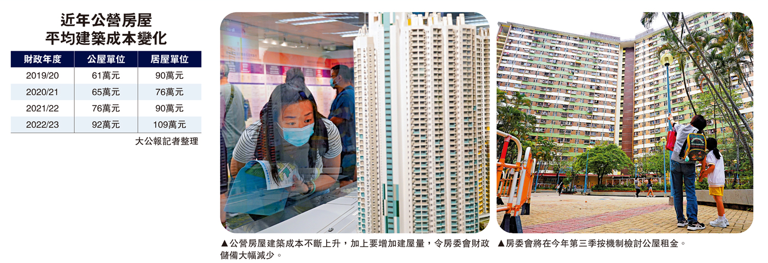 建屋量增加及建築成本上升,勢必加重房委會財政負擔。房委會財務小組委員會預計下年度公屋以及居屋的建造成本會比現時增加兩成,分別增至92萬元及109萬元,未來5年建築開支將高達1721.9億元,房委會財政儲備料在2027/28年跌至406億元低位。