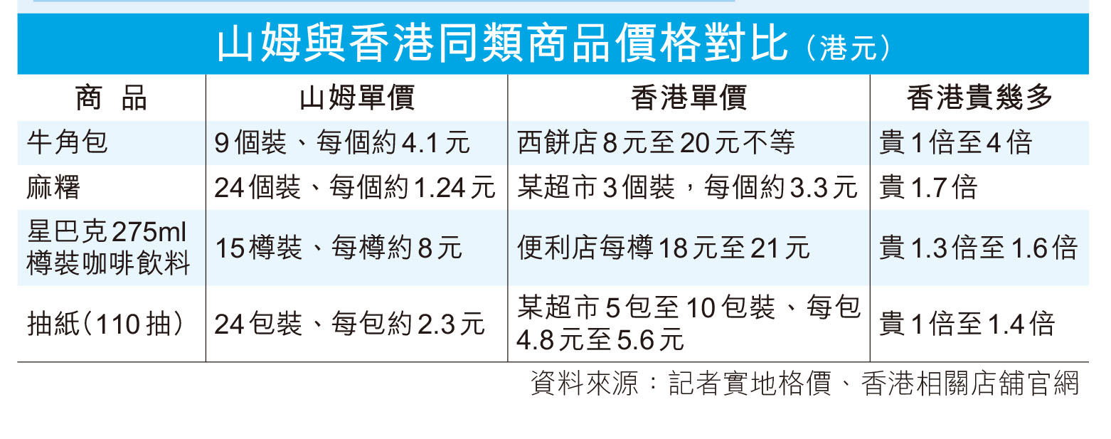 香港仔專題組報道,北上消費潮愈吹愈熾熱,倉儲式超市「山姆店」火爆之際,深圳本周六更將有另一間大型連鎖超市Costco開幕,勢必成為港人另一消費熱點。本報記者在剛過去的周日(7日)直擊「山姆店」港人瘋狂掃貨盛況,現場幾乎六七成客人是香港人,到處聽到廣東話,有人一行6人總共購買4,000多元人民幣的食品、日用品等,大呼過癮、即場瓜分「戰利品」。他們表示,內地購物體驗富新鮮感,這都是香港消費所缺乏的。業界認為,香港零售業必須繼續強化自身國際化的優勢,吸納來自各地的旅客。