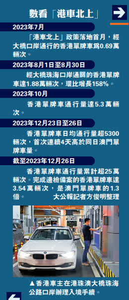 「以往幾個月才去一次珠三角,『港車北上』實施半年多來,我們幾乎每月北上好幾次。」香港車主何先生表示,過去北上要搭乘巴士或火車,行程需提前規劃,隨行的大包小袋也盡量「精簡」。現在自駕「想走就走」,行程更加從容,「一腳油逛粵」、「一車滿返程」的消費場景頻頻上演。