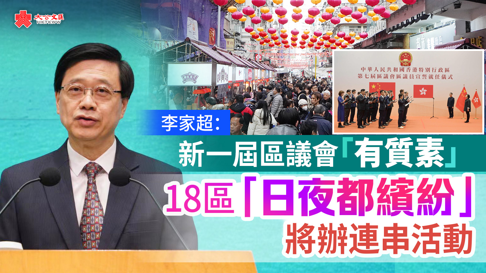 大公文匯全媒體報道,新一屆區議會議員於今年1月1日宣誓就任,行政長官李家超今日(9日)出席行政會議前見記者時形容新一屆區議會是一個「有質素的區議會」,期望區議員盡快展現成績,用點點滴滴的實際行動回報廣大市民。他提到,全港18區由今個月到5月將以「日夜都繽紛」為主題舉辦一連串活動,有助體現各區特色及文化,振興地區經濟。