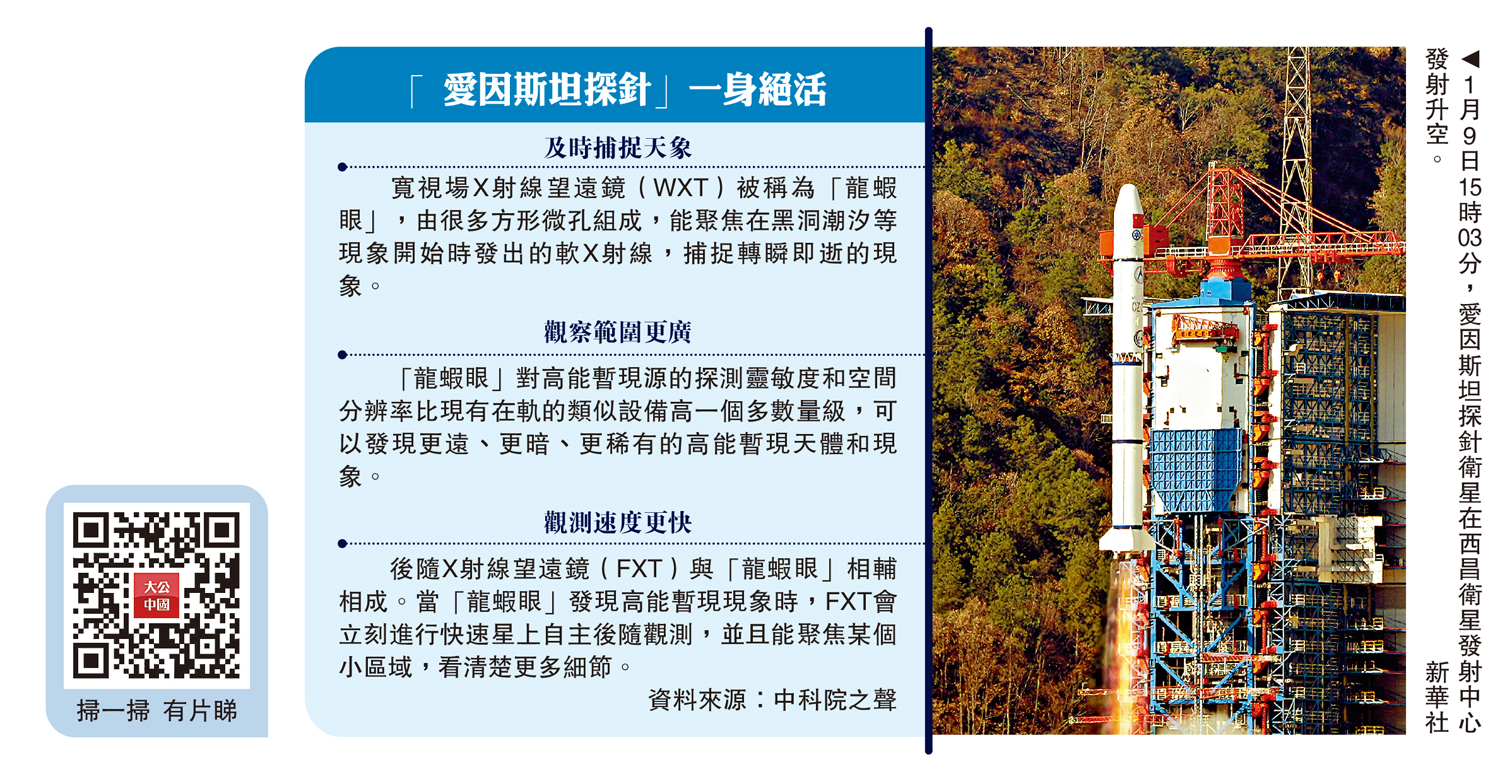 (大公報 記者 劉凝哲)1月9日15時03分,中國在西昌衛星發射中心採用長征二號丙運載火箭,成功將愛因斯坦探針科學衛星發射升空,衛星順利進入預定軌道,發射任務取得圓滿成功。