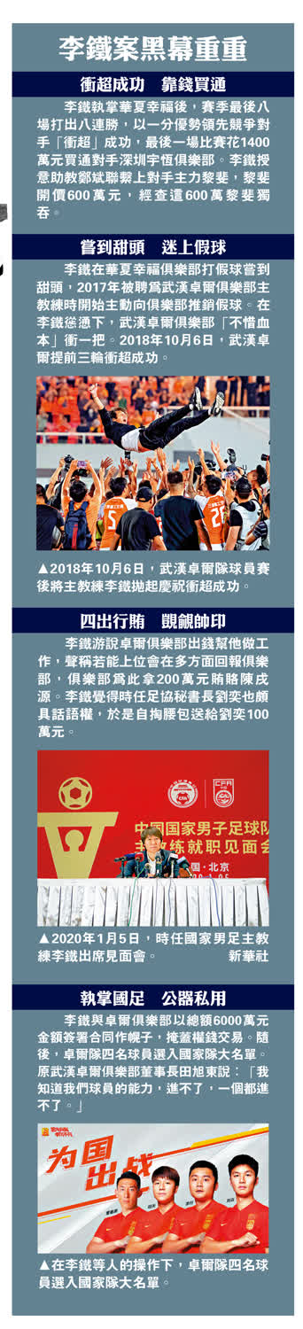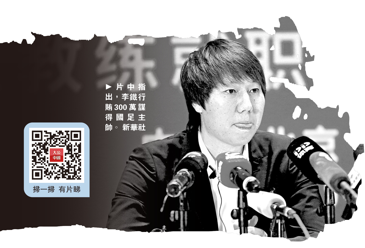 大公報援引央視新聞報道,央視9日播出年度反腐大片《持續發力縱深推進》第四集《一體推進「三不腐」》,首次披露了觸目驚心的足壇腐敗案情,直言足球領域出現了系統性、塌方式腐敗。國足原主教練李鐵靠俱樂部重金買來「衝超奇跡」,單一球賽花費1400萬元(人民幣,下同)收買對手俱樂部、主教練、球員。其後,他向足協官員行賄300萬元得以執教國家隊;成為國足主教練後,和武漢卓爾俱樂部以總額6000萬元的金額,簽下了一紙所謂的「合同」,掩飾「權錢交易」,將卓爾隊的四名球員選入了國家隊大名單。