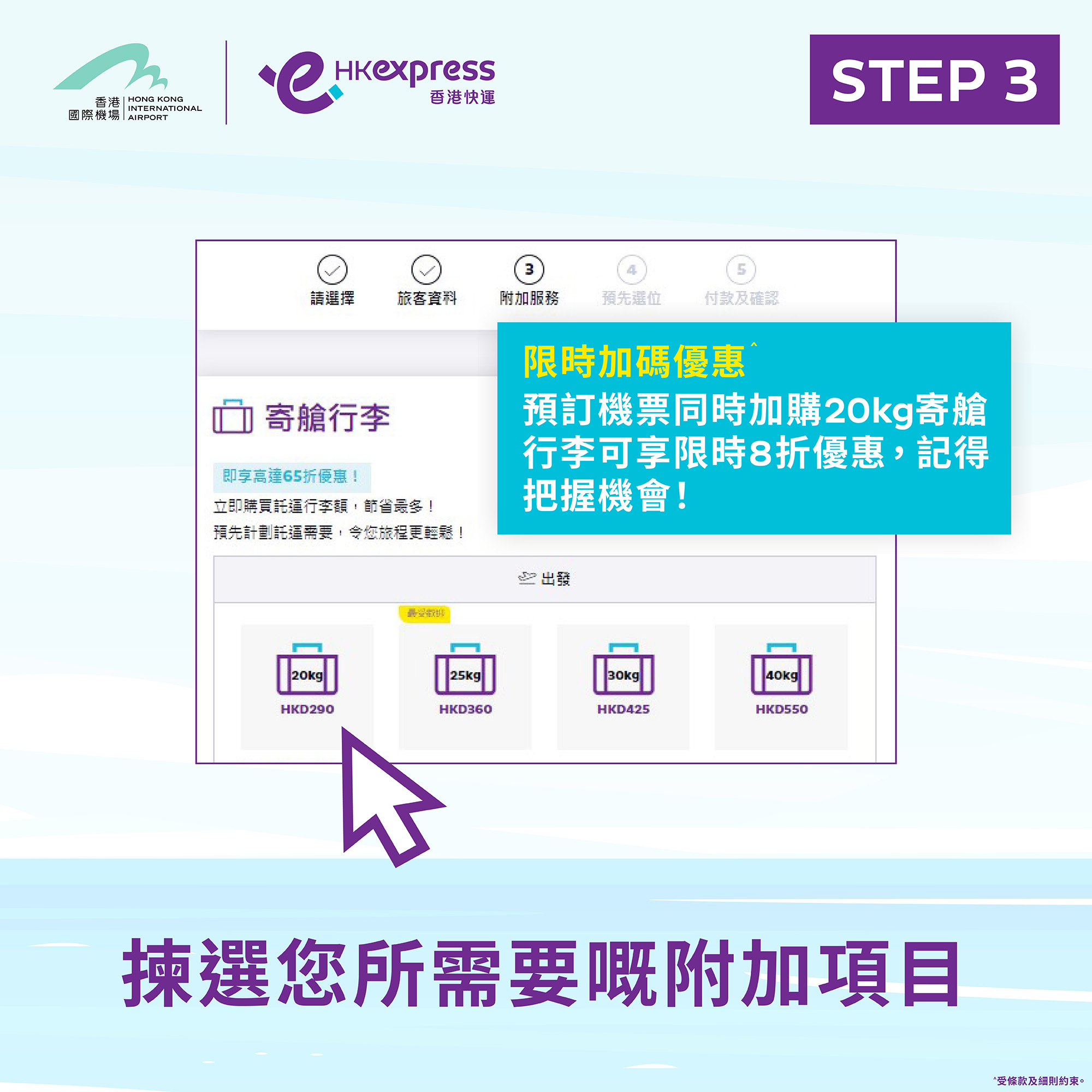 此外,活動推出限時加碼優惠,於活動初次預訂時添加20kg寄艙行李可享限時8折優惠。