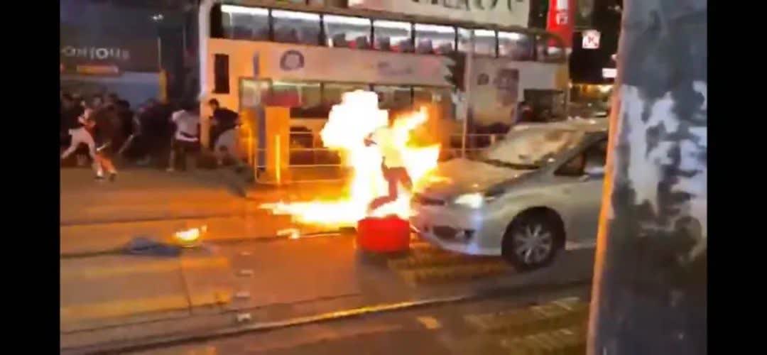 2019年10月4日,全港18區被蒙面暴徒瘋狂縱火。在元朗,一名便衣警察被暴徒圍毆至頭破血流,更被汽油彈掟中變成火人,手部嚴重燒傷。