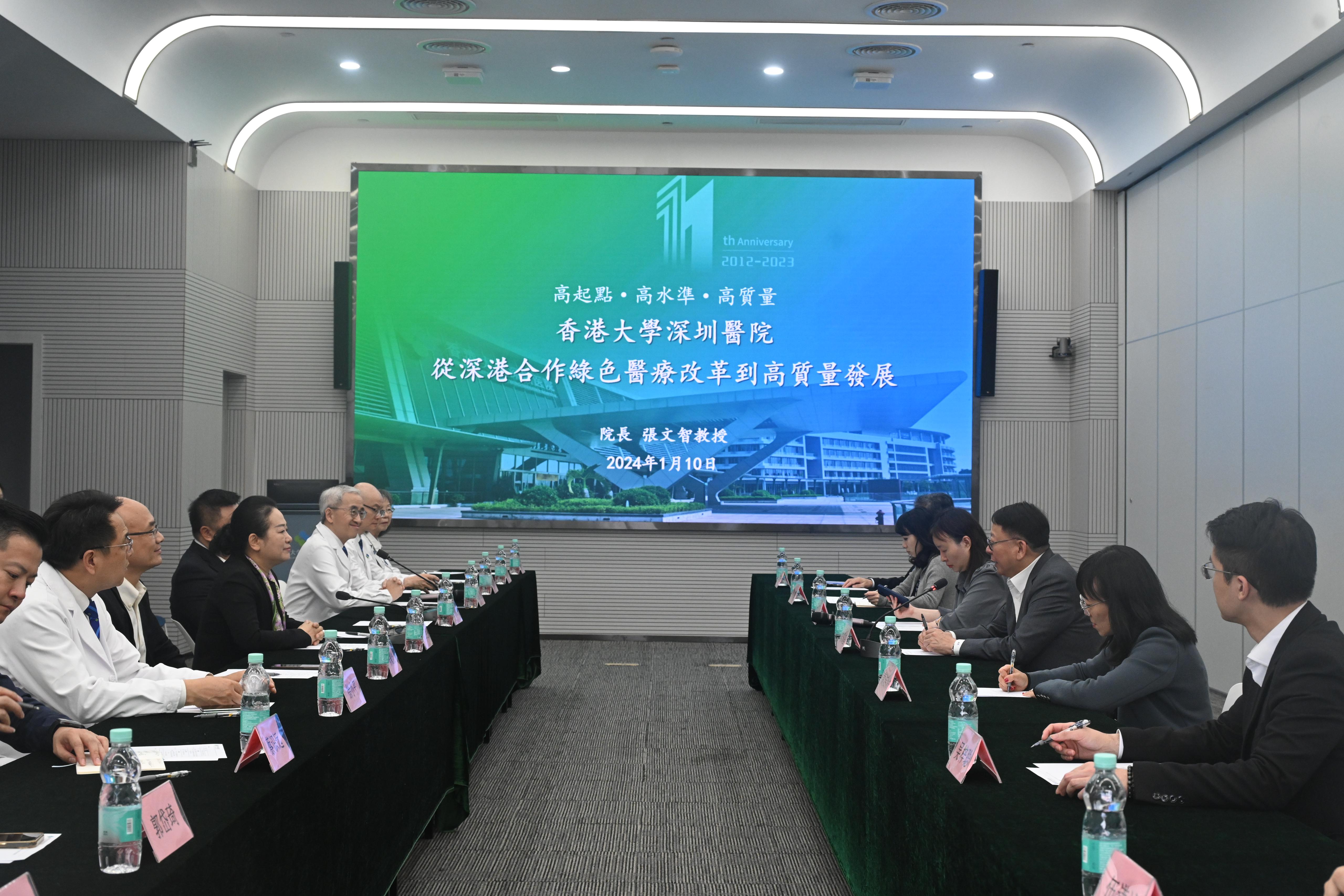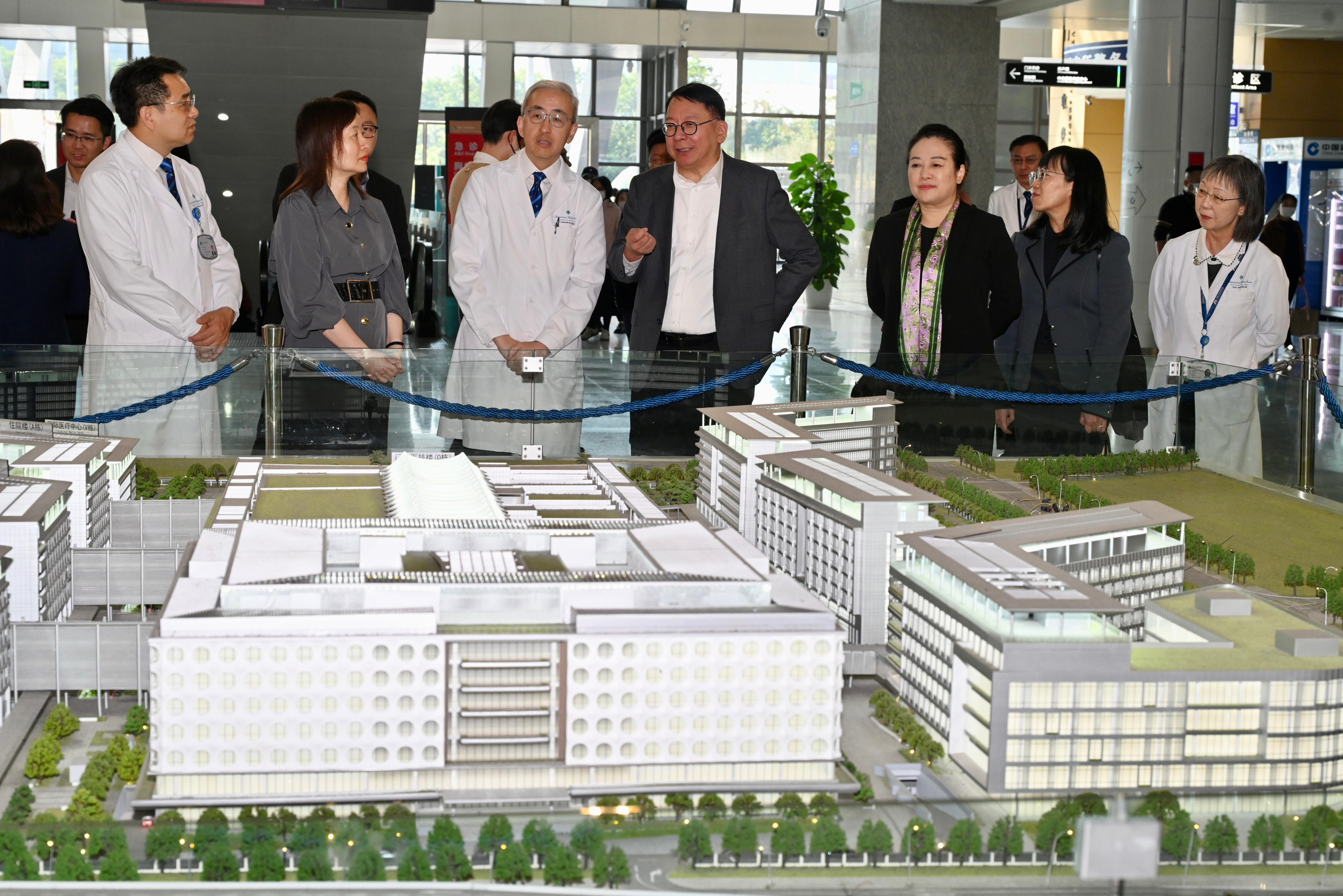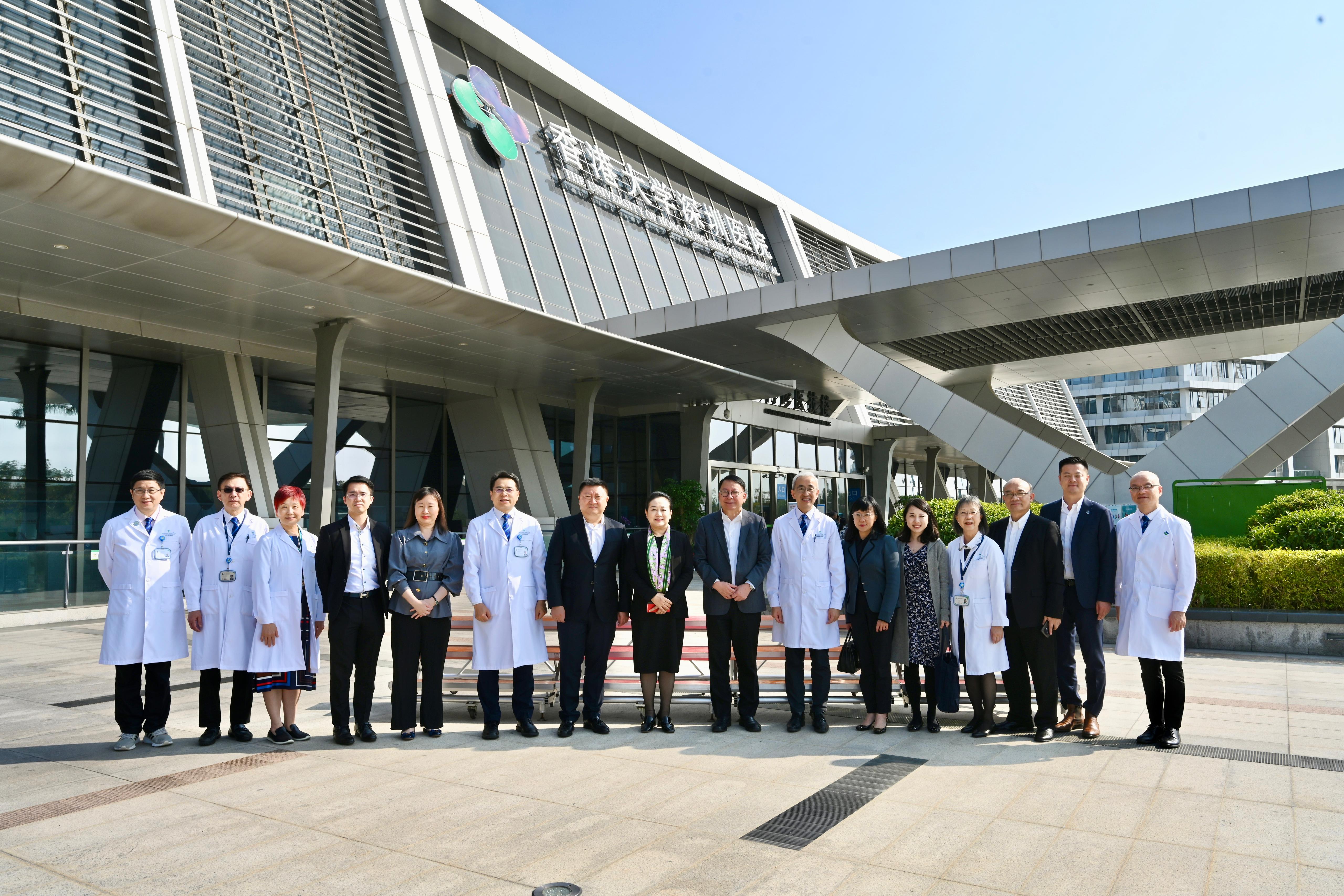 今日下午回港前,陳國基參觀香港大學深圳醫院,與深圳市衞生健康委員會黨組書記、主任吳紅艷,以及院長張文智教授和院方醫護人員交流。他欣悉港大深圳醫院在成立短短十多年間發展迅速,並取得多項成就,包括成為三級甲等綜合醫院、廣東省高水平醫院,以及國家衞健委公立醫院高質量發展試點醫院。