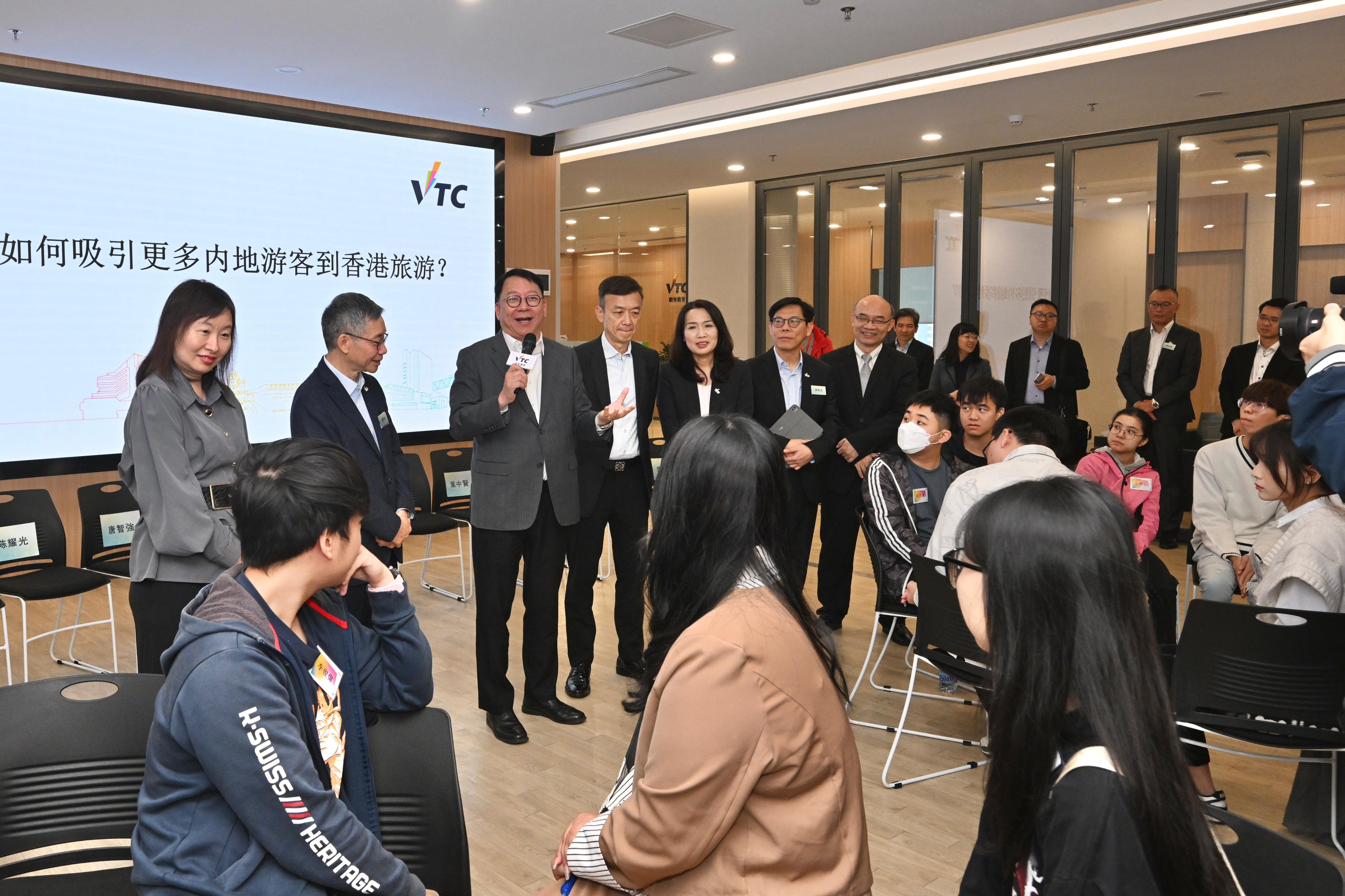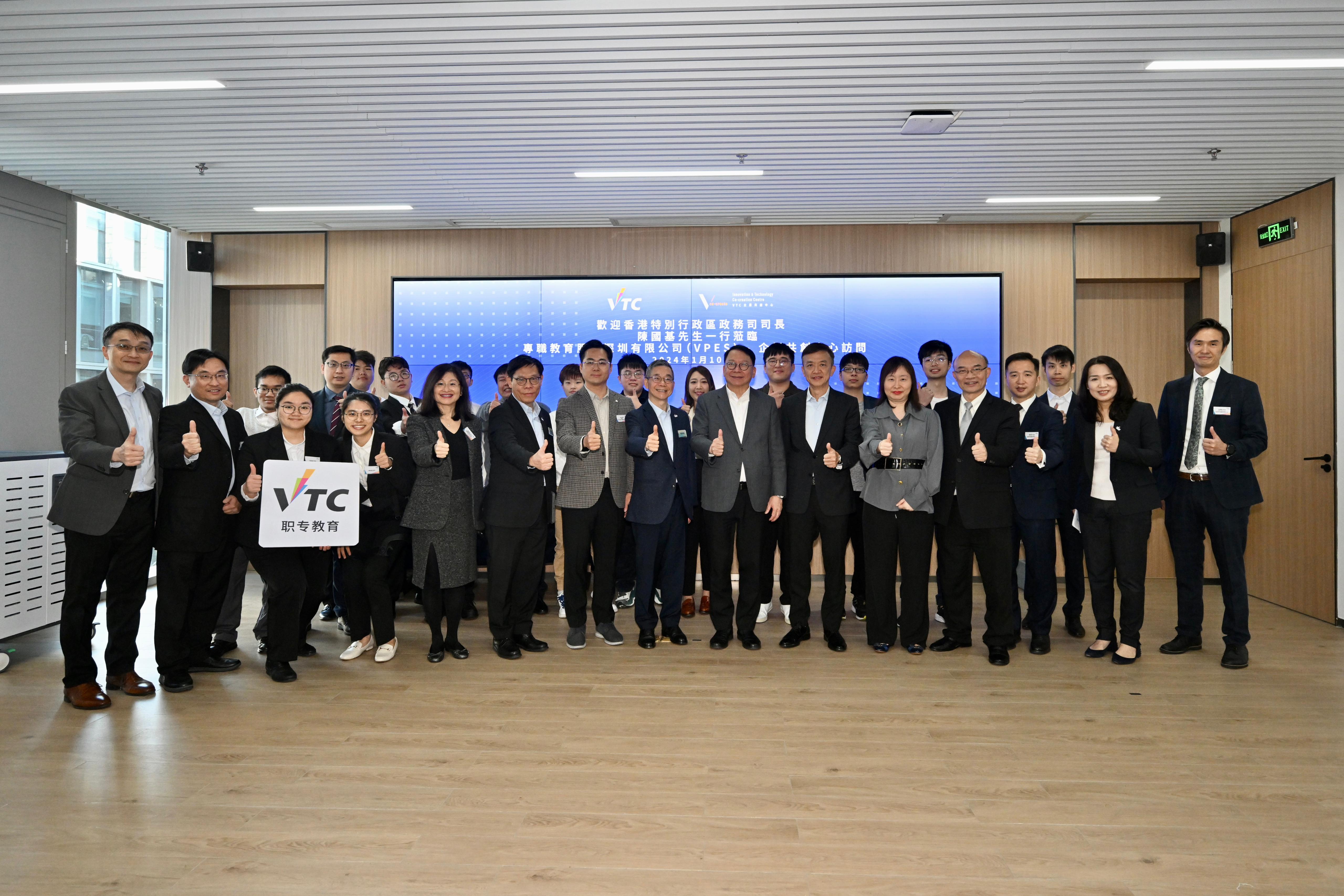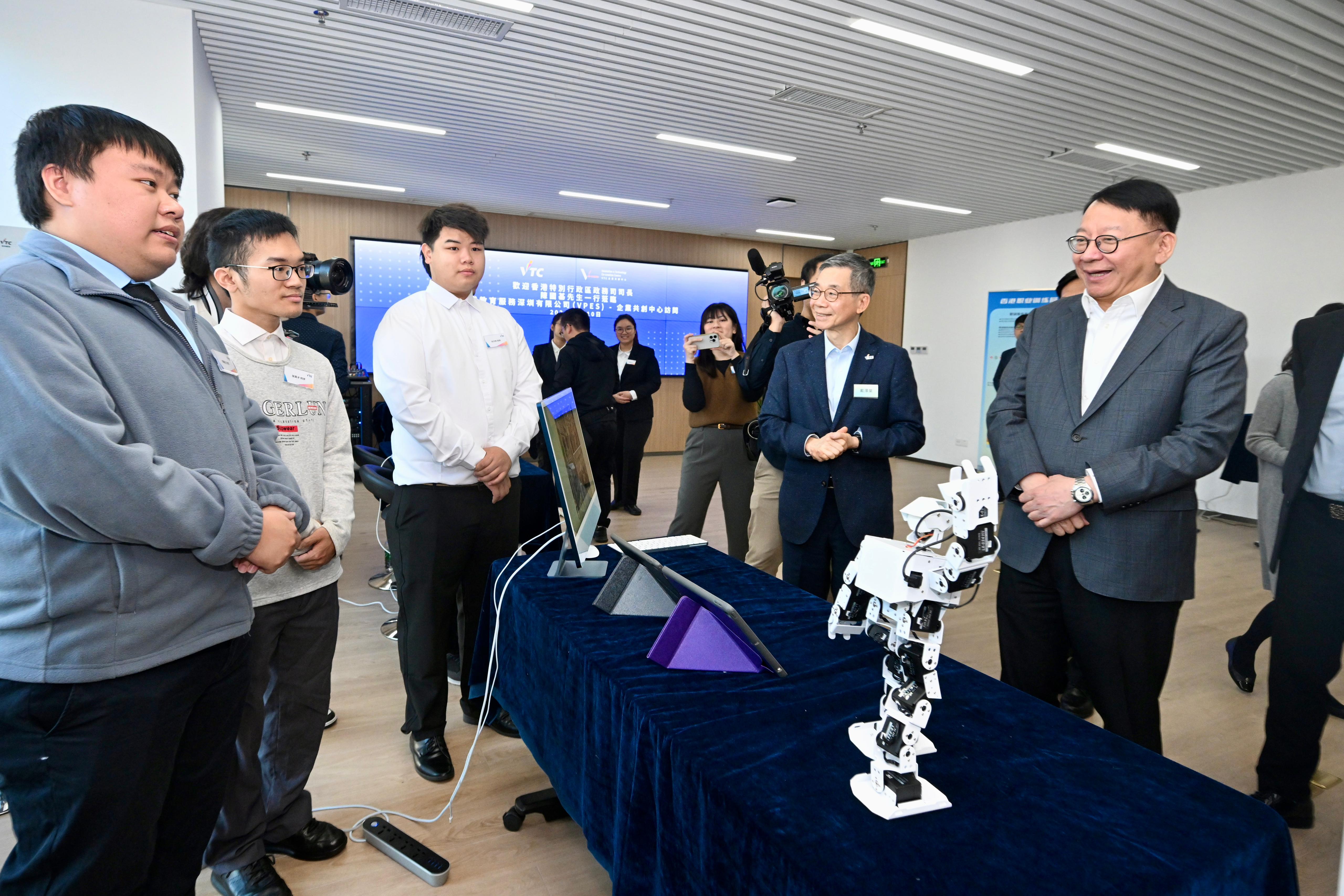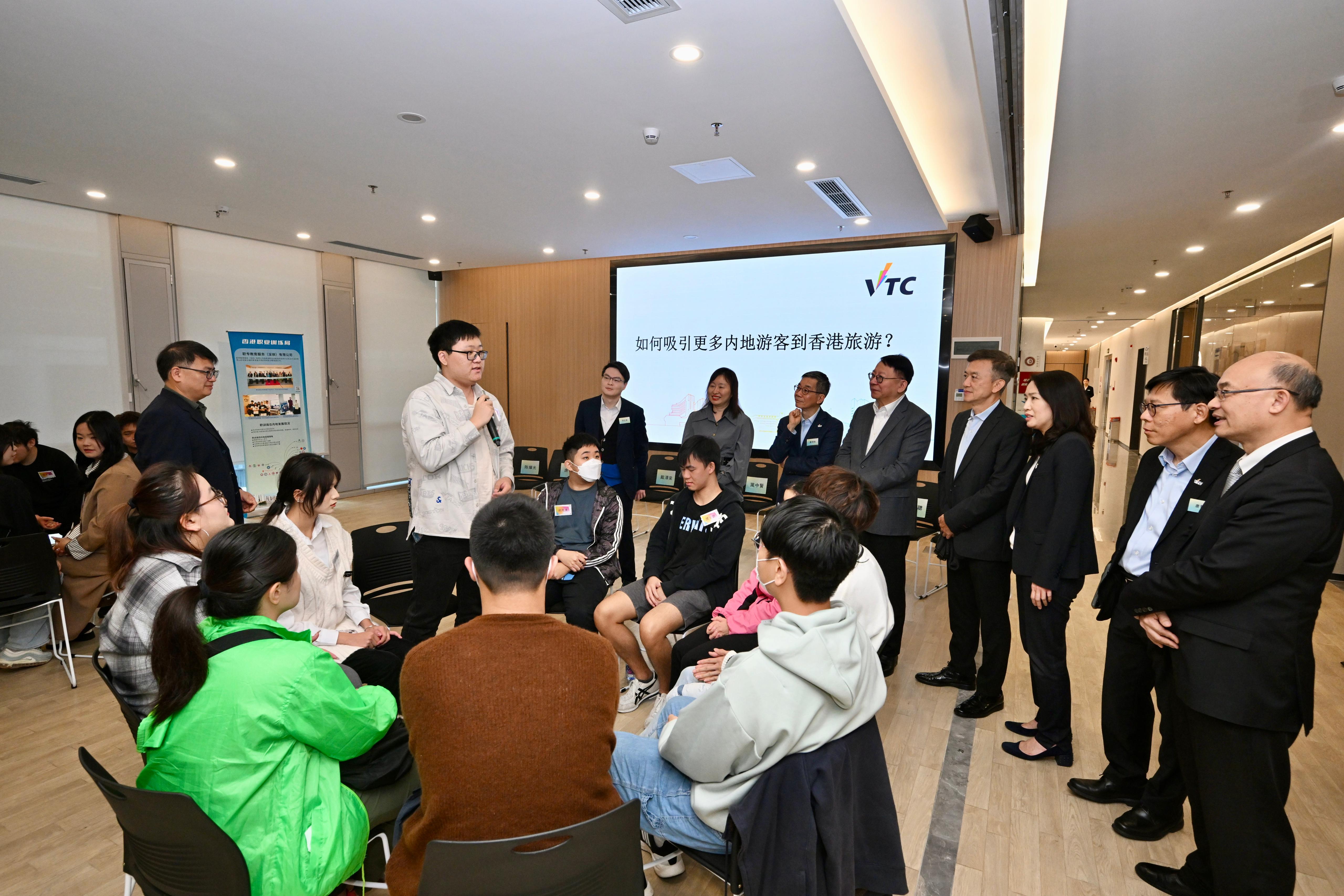 早上,陳國基參觀香港職業訓練局首個內地運作中心──職專教育服務(深圳)有限公司,聽取職訓局主席戴澤棠和執行幹事唐智強介紹中心的運作情況。他亦與職訓局學生和深圳職業技術大學學生傾談,了解學生共同開展的不同科研項目,並就深化港深兩地職專教育合作交流意見。他欣悉職專教育服務(深圳)有限公司自去年正式啟動以來運作暢順,積極擔當職專教育交流平台的角色,推動職訓局與內地院校、企業和機構合作,通過課程交流、專題研習、工作實習等活動,協助更多香港青年了解國家發展,並讓內地青年認識香港職專教育和發展出路,其中包括通過去年施政報告公布的職專畢業生留港計劃,在職訓局指定全日制高級文憑課程畢業後留港一年,尋找相關專業的工作。