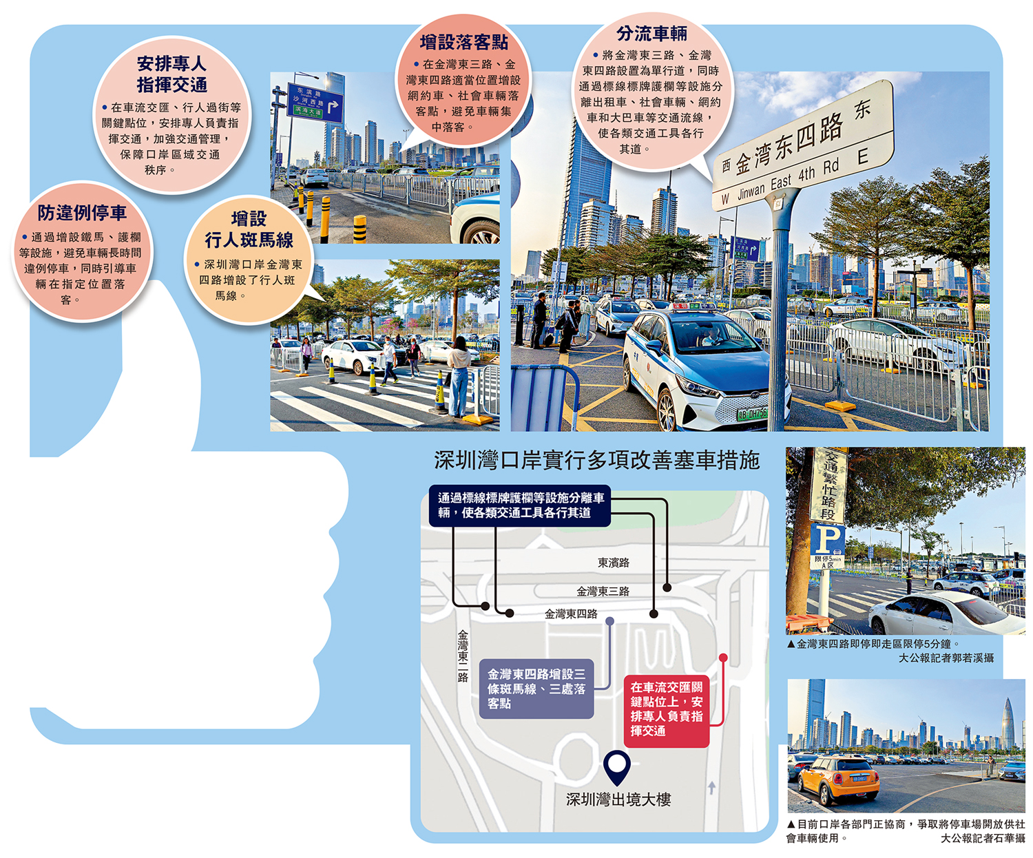 昨日下午,大公報記者趕到深圳灣口岸深圳一側時,發現金灣東四路增設了三條斑馬線,在車流交匯、行人過街的關鍵點位上,安排了專人負責指揮交通,從望海路進入深圳灣口岸再離開口岸區域,車程約5至10分鐘左右。雖然增設了臨時落客點,但仍有小部分車輛並未按照指引落客。