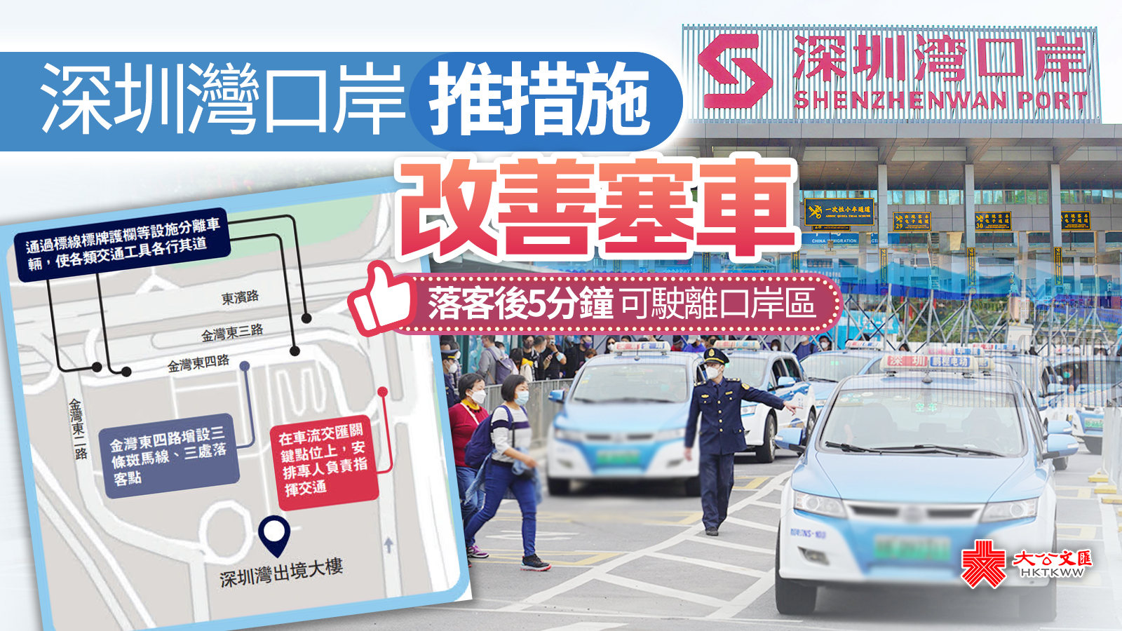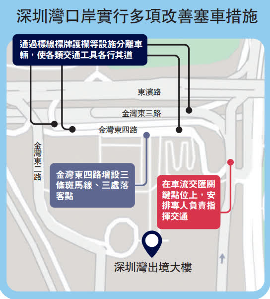 據南山區政府相關工作人員介紹,根據深圳灣口岸的現狀,他們把金灣東三路、金灣東四路設置為單行道,同時通過標線標牌護欄等設施分離出租車、社會車輛、網約車和大巴車等交通流線,使各類交通工具各行其道,簡化了口岸區域交通組織,增大了道路行車空間。