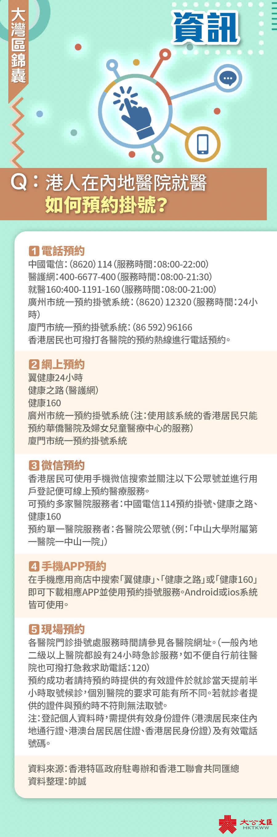 所需證件:港人若在粵港澳大灣區就醫,需提供港澳台居民居住證、港澳居民來往內地通行證(「回鄉證」),或香港居民身份證,並以電話號碼作登記。