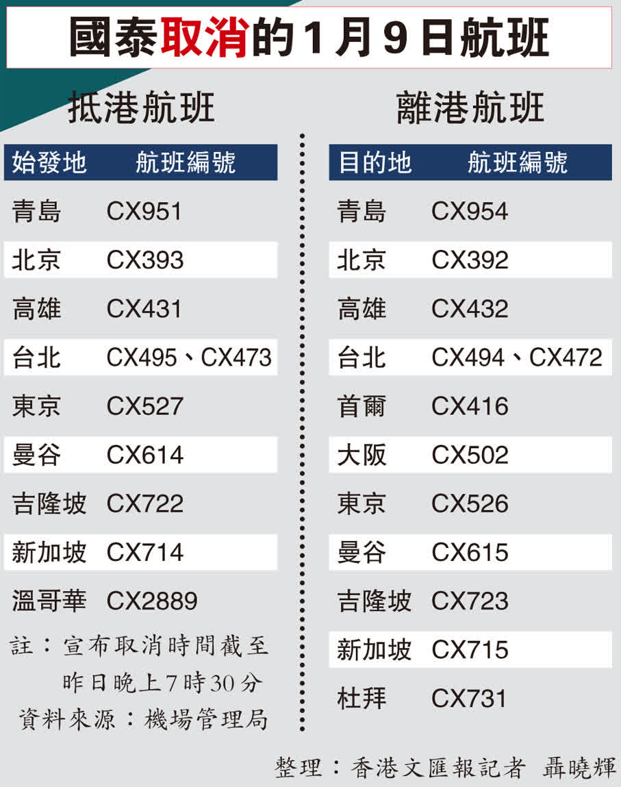 1月9日,行政長官李家超表示,特區政府非常關注國泰情況,要求國泰一定要盡一切努力,確保將受影響旅客的不便及損失降到最低。李家超表示,長遠來講,國泰需檢視人力、整體運力的長遠發展及安排。
