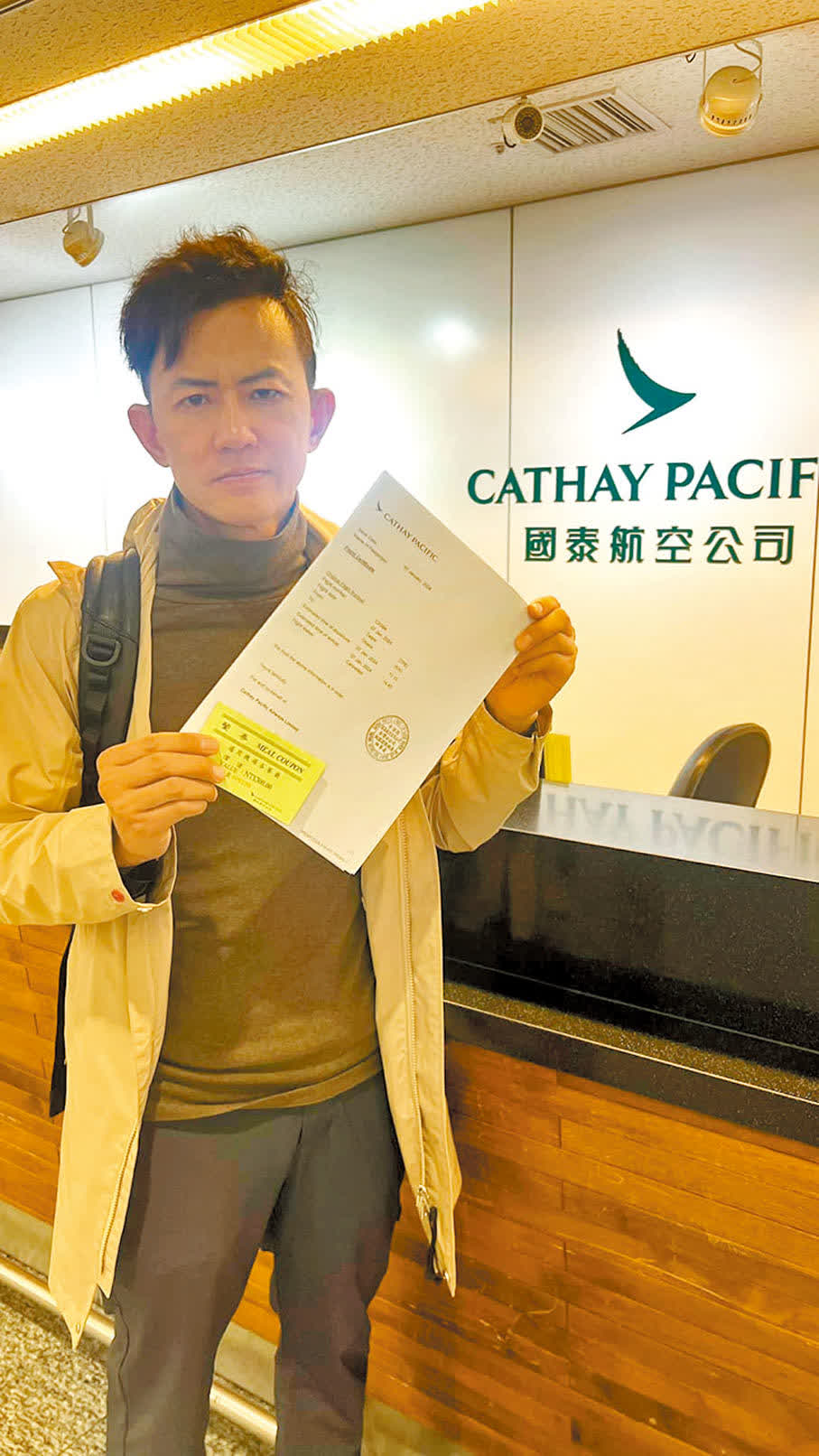 這一天,乘客中的「旅遊達人」項明生中午發帖指出,原本計劃乘搭當天上午11時15分的國泰航空CX564,卻被國泰的地勤人員告知:「不好意思,你的班機取消了!」他向國泰提出退款,當地地勤提出僅可賠償300元新台幣(折合約76港元)的餐廳禮券,並叫他自行上網填退款表格。