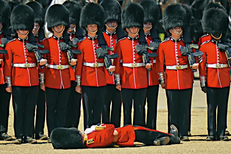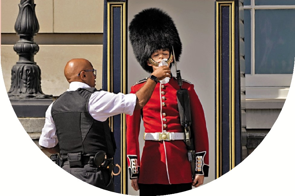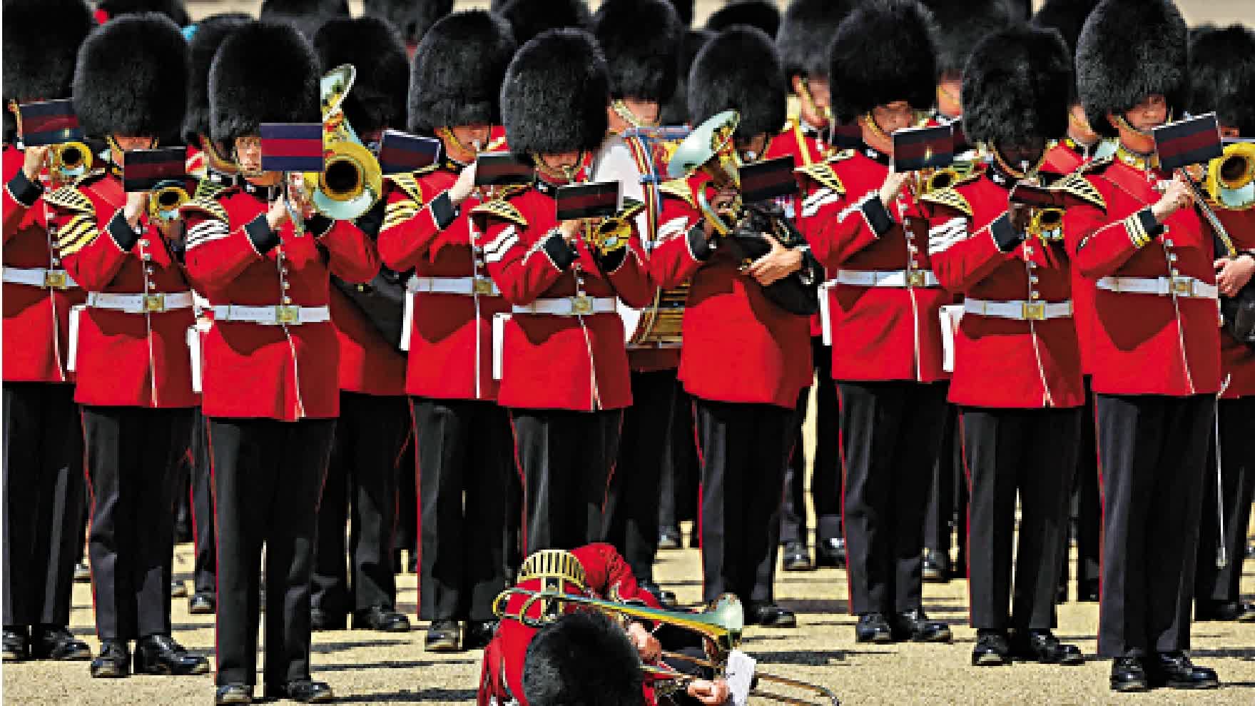 去年6月,英國倫敦氣溫飆升至30℃,至少3名身穿羊毛軍裝、頭戴熊皮帽的皇家衛兵,在君主壽辰軍禮的綵排儀式中熱到暈倒。