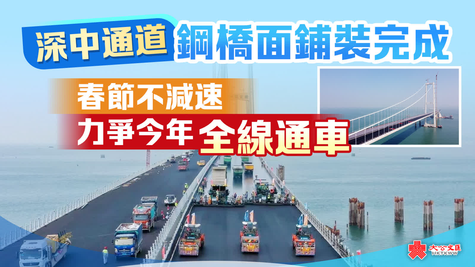 (大公文匯網 記者 方俊明)粵港澳大灣區「超級工程」深中通道建設迎新突破!記者今天(12日)從廣東交通集團獲悉,目前深中通道完成全部鋼橋面鋪裝施工。隨着深中通道伶仃洋大橋「東洩洪區右幅瀝青」攤鋪結束,深中通道鋼橋面鋪裝圓滿完成,同時標誌着世界上最大規模的「熱拌環氧瀝青鋼橋面鋪裝工程」高質量完工,力爭今年全線建成通車。