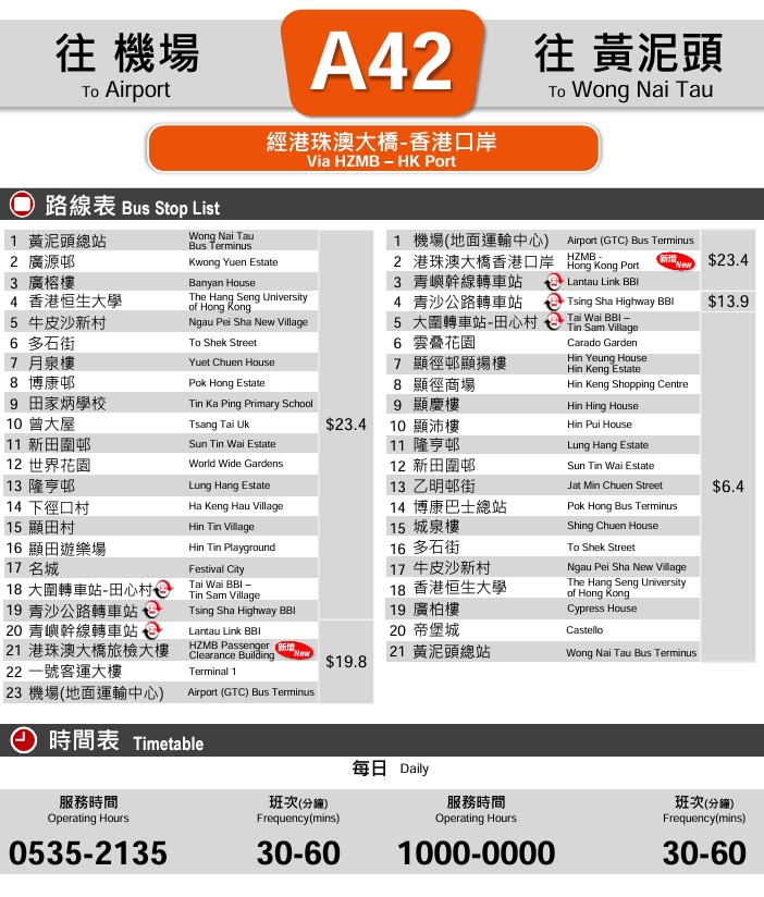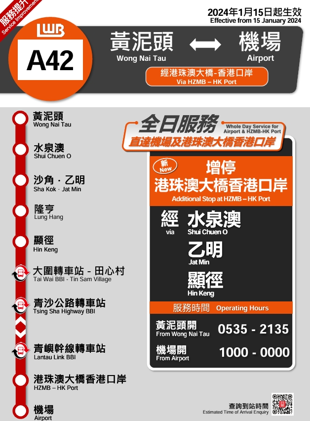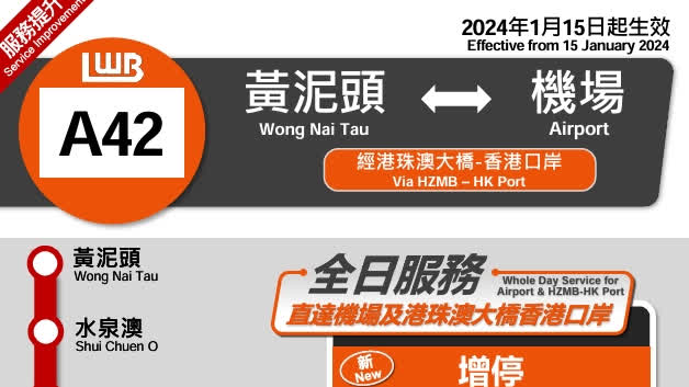 龍運與運輸署積極溝通及落實安排後,將於2024年1月15日(星期一)起,為A42線升級至全日服務。A42線亦會新增停靠港珠澳大橋香港口岸,以滿足居民的出行需要。黃泥頭開出時間為早上5時35分至晚上9時35分;機場開出時間為上午10時至凌晨0時,全程車費23.4元。