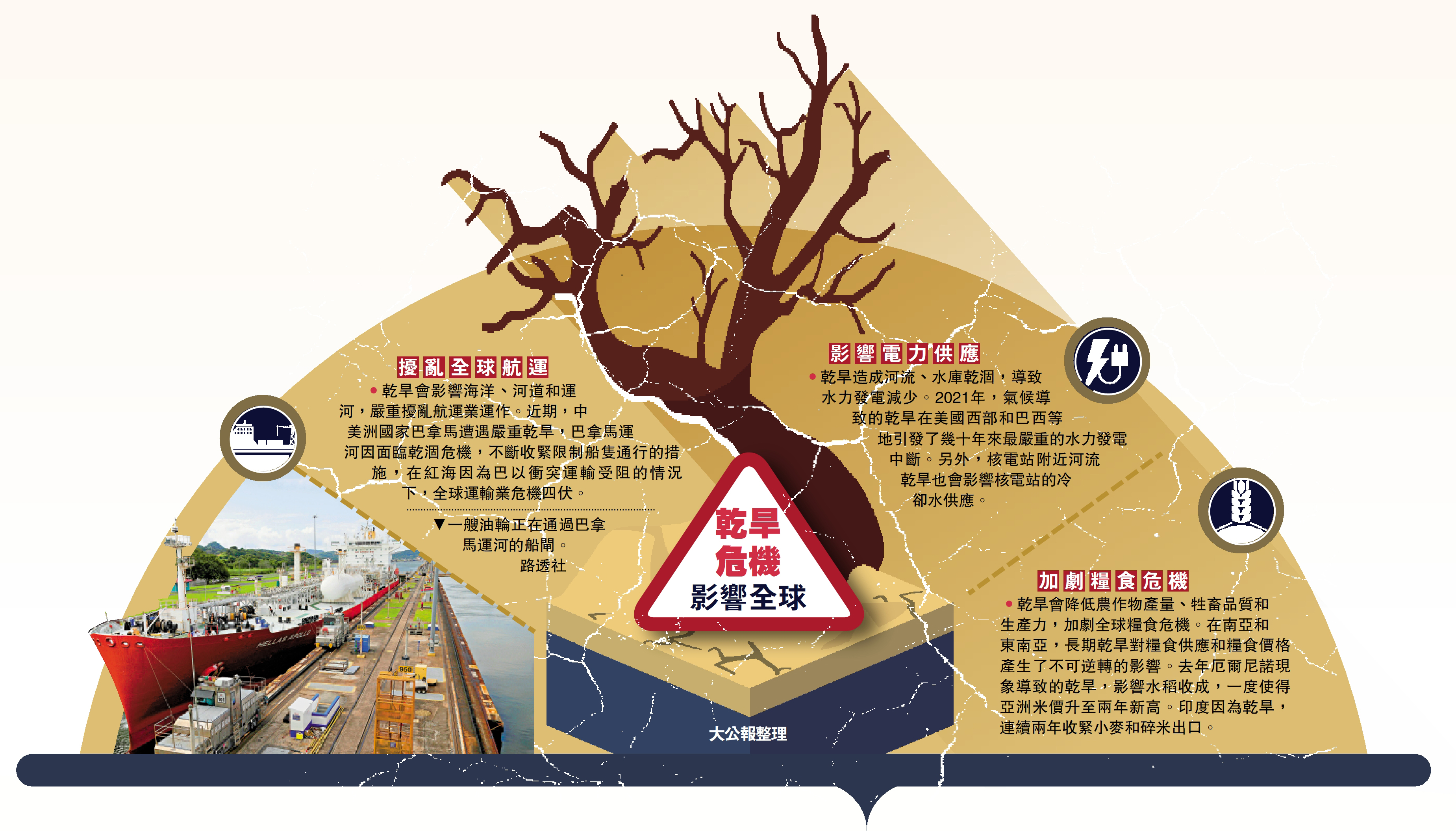 大公報綜合《紐約時報》、CNBC報道:全球持續受到乾旱影響,聯合國估計,在2022年至2023年,全球有18.4億人生活在乾旱之中,佔全球人口的近四分之一。嚴重乾旱威脅到包括糧食、航運在內的多個領域,中美洲航運要道巴拿馬運河近期飽受乾涸困擾運輸能力不足,航運巨頭馬士基(Maersk)近期已被迫改用陸路運輸。