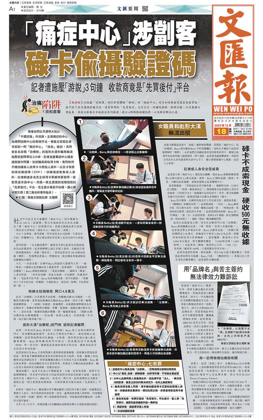 (香港文匯報記者 文森 文禮願)香港文匯報上月獨家揭露香港有痛症中心涉不良銷售,軟硬兼施逼令顧客購買高昂療程。由於該痛症中心沒有商業登記、無法完成信用卡交易,中心遂利用「先買後付」平台HEROPLUS收取款項,顧客事前卻毫不知情。前日,痛症中心聲稱被代收款的HEROPLUS「走數」495萬元,要求客戶自行向HEROPLUS交涉退款安排。有苦主向香港文匯報表示,懷疑中心與HEROPLUS「扯貓尾」,互相推卸責任,導致苦主追討難上加難,有苦主擬再次報警求助。至香港文匯報截稿前,痛症中心和HEROPLUS均未回應事件。