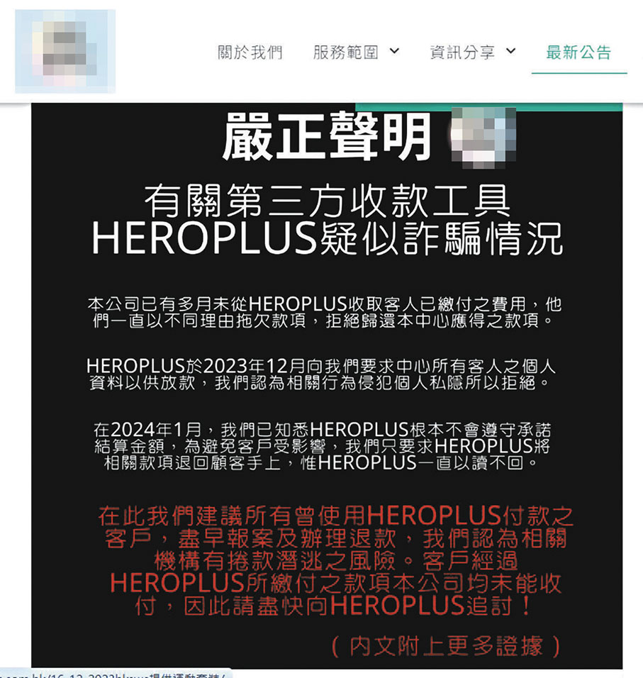 前日,涉事痛症中心突然於官網發出「嚴正聲明」,聲稱被HEROPLUS「走數」,指控對方疑似詐騙,但並未交代是否報警,反而「將個波踢俾(畀)顧客」,稱因為HEROPLUS違約沒付款予痛症中心,因此中心對顧客停止服務,要求顧客自行向HEROPLUS追討付款。該公告稱:「第三方收款工具HEROPLUS疑似詐騙情況:HEROPLUS為第三方收款平台,以協調服務供應方向顧客收款,承諾於7個工作天內向商戶(痛症中心)支付客人繳付之金額。惟HEROPLUS沒有遵守相關承諾,一直拖欠款項,以致本公司根本已有多月沒有收入。」