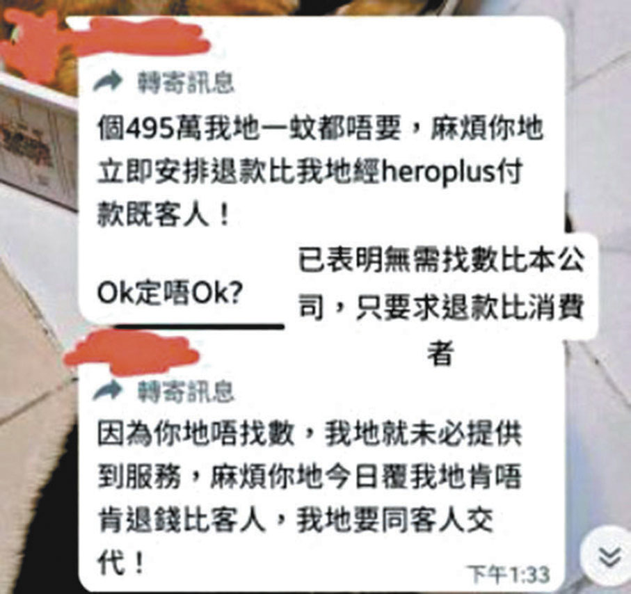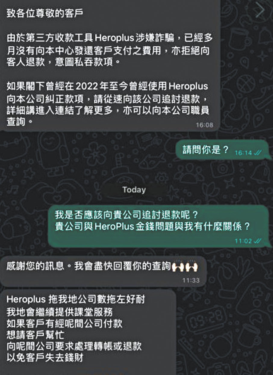中心聲稱,一直向HEROPLUS追討無果,要求HEROPLUS將所有款項退還予客人,亦不獲理會。「在此我們附上證據,希望最近半年曾經在我們中心經過HEROPLUS付款之客戶盡快向其退款,避免遭受更多損失。」