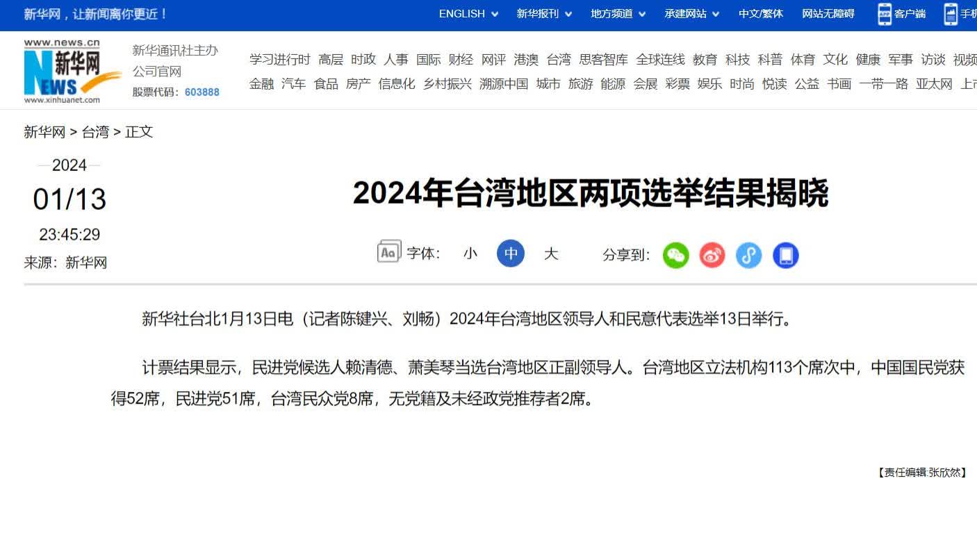 計票結果顯示,民進黨候選人賴清德、蕭美琴當選台灣地區正副領導人。台灣地區立法機構113個席次中,中國國民黨獲得52席,民進黨51席,台灣民眾黨8席,無黨籍及未經政黨推薦者2席。