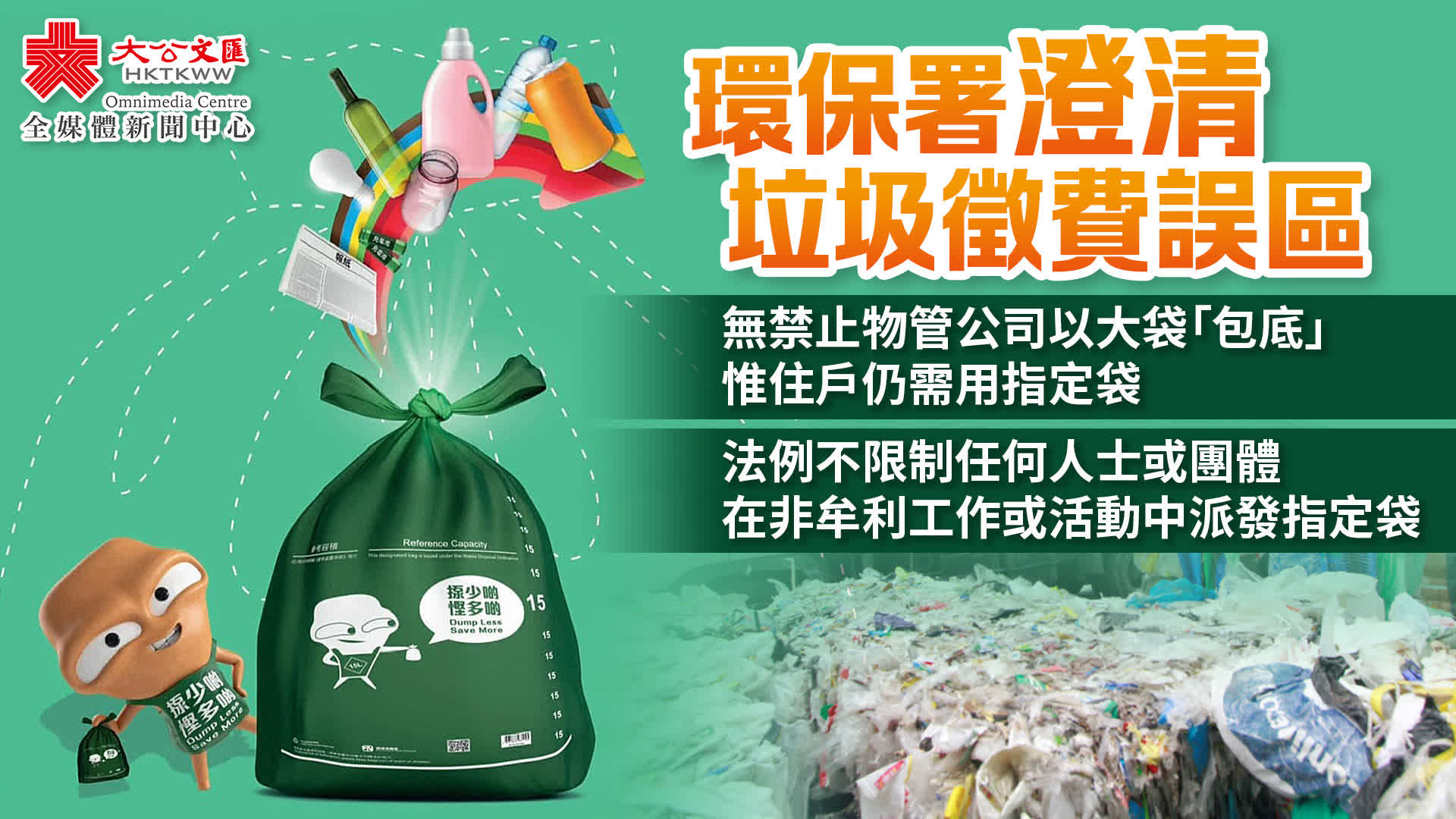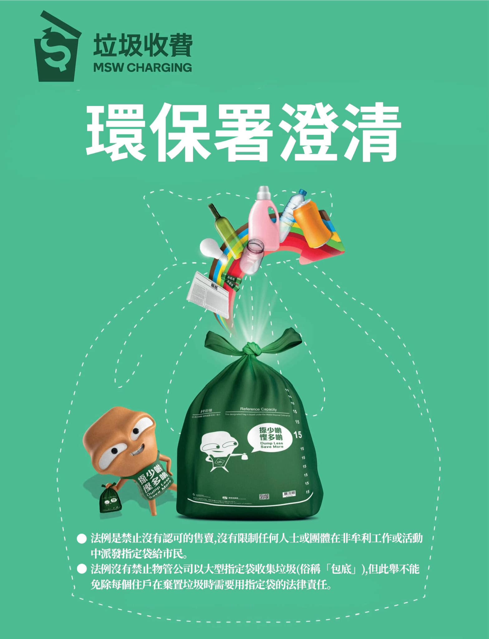 另外,環保署指,近日亦有意見指法例不容許向有需要人士派發指定袋,亦不容許物業管理擺放大型指定袋收集住户的垃圾。署方強調,法例禁止無認可的售賣,但沒有限制任何人士或團體,在非牟利工作或活動中派發指定袋給市民。