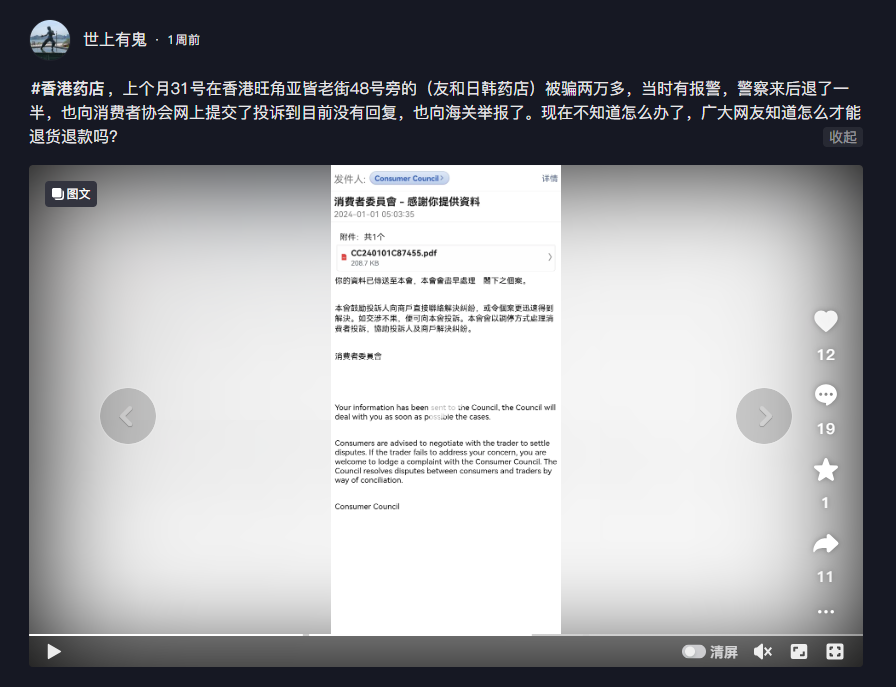 據大公文匯全媒體記者查閱資料,曾有內地網友本月初在社交平台發布文章投訴該藥店,稱自己「上個月31號在香港旺角亞皆老街48號旁的藥店被騙兩萬多,當時有報警,警察來後退了一半,也向消費者協會網上提交了投訴,到目前沒有回覆,也向海關舉報了。現在不知道怎麼辦了,廣大網友知道怎麼才能退貨退款嗎?」