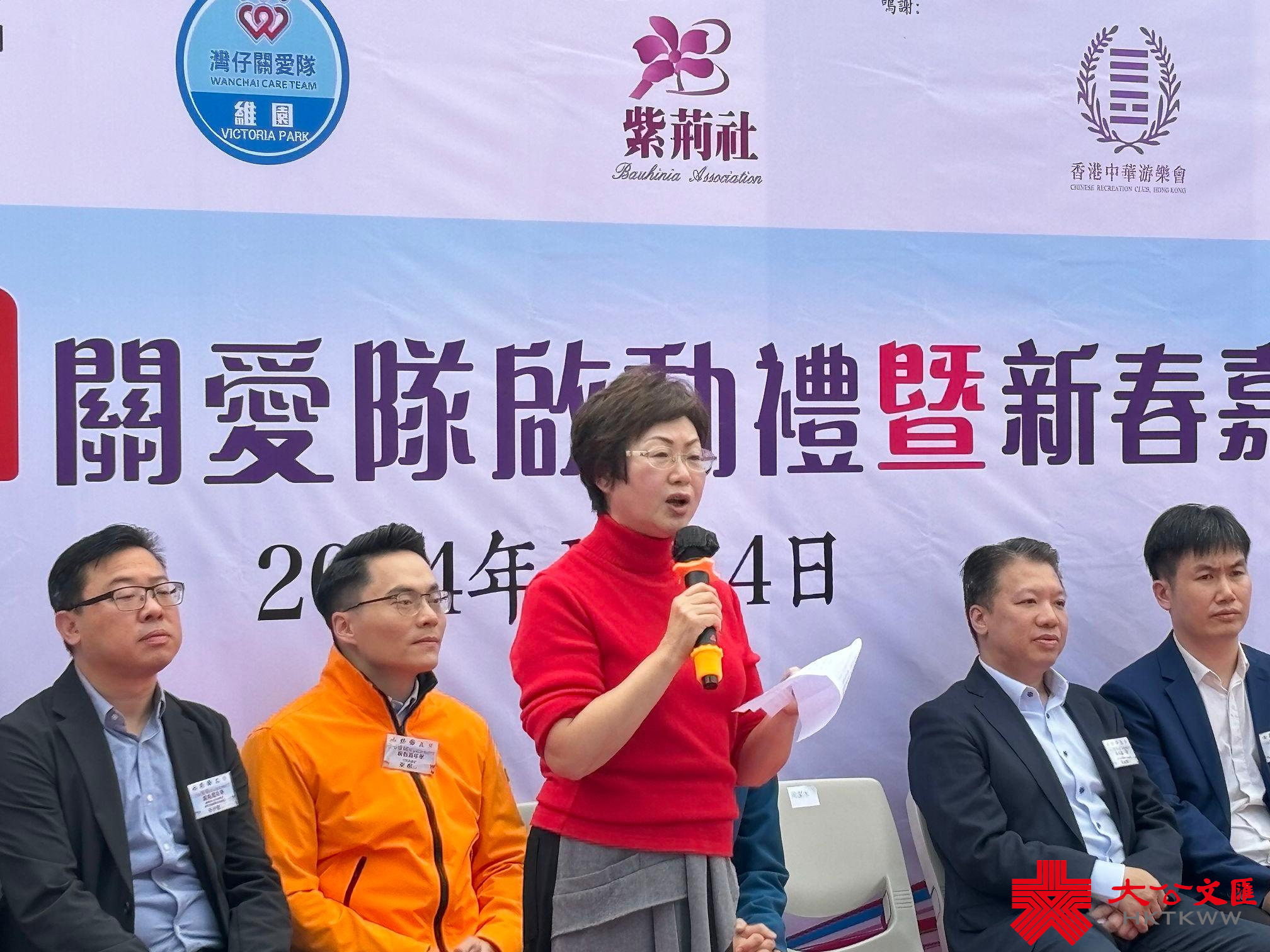 紫荊社主席及灣仔區維園關愛隊隊長周潔冰表示,在這個特別時刻,共同見證灣仔區維園關愛小隊成立,令人振奮。灣仔區是一個多元化社區,擁有不同背景的居民,包括基層、中產、少數族裔及新來港人士等,社區亦有不少新舊共融特點,維園區大部分是私人樓宇及商廈,也有「三無大廈」,社區服務工作是一個大挑戰。幸好獲得不少地區夥伴團體及商界等支持,共同編織一個社區愛心網絡,發揮關愛社區的團隊精神。展望未來,期望團隊積極發揮服務社區、協助政府傳遞信息和轉達居民意見的最大功能。她續指,維園區關愛隊組成多元共融,凝聚了不同界別的力量包括青年、婦女和專業人士,具備一定地區網絡和服務經驗,團隊將積極參與,定期探訪居民,為有需要人士提供支援包括家居維修等服務,共同構建一個關愛融和的維園區。