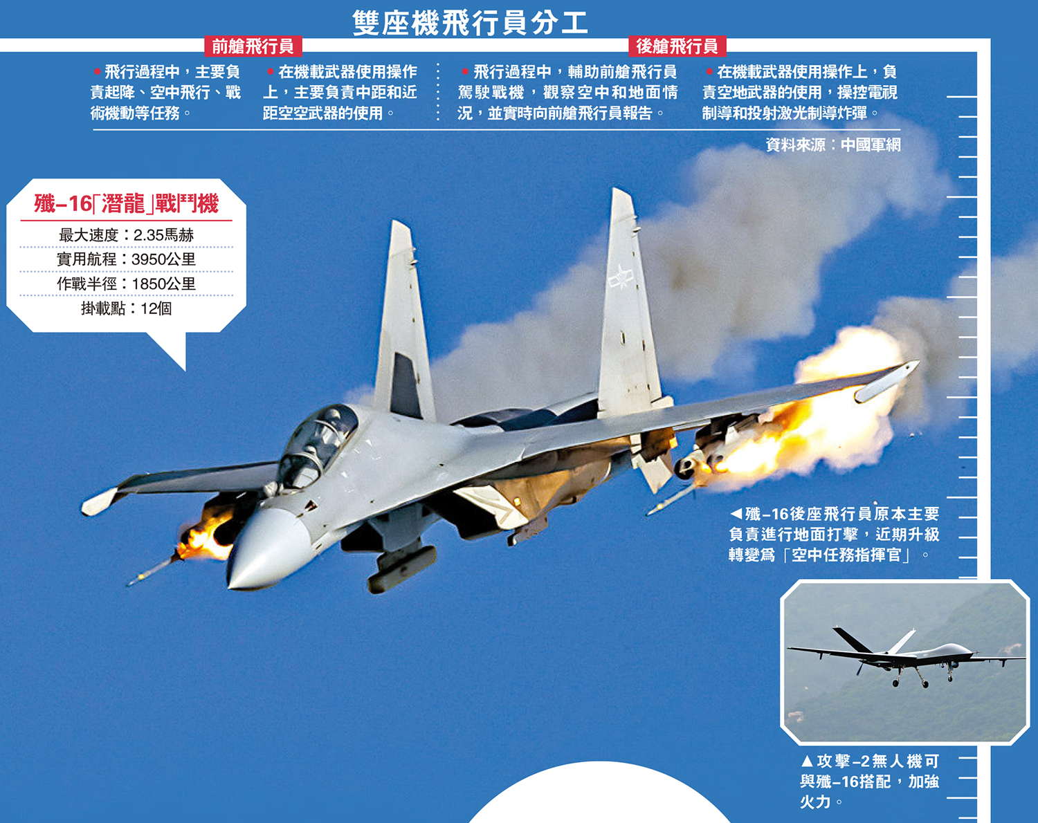 (馬浩亮<文>)在中國空軍近期訓練中,雙座雙發多用途重型戰鬥機殲-16「潛龍」的後座飛行員,角色已經從原來的「武器控制員」,升級轉變為「空中任務指揮官」,其職責更為廣泛,包括與各型戰機協同,並與地面部隊、水面艦隊協作,以至指揮調度攻擊無人機「蜂群」,豐富體系化作戰,也為未來雙座版殲-20S指揮「忠誠僚機」等相關作戰模式、體系進行了探路。