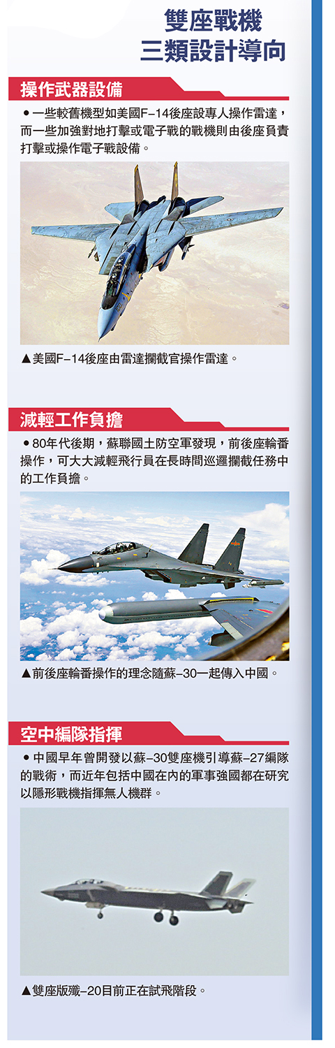 第二類主要是肩負對地、反艦打擊任務的戰機。這種情況下,前座飛行員負責駕駛和空戰,後座飛行員負責對地、反艦攻擊。殲-10AS、殲-11BS、殲-15S等雙座版戰機,一方面作為同類機型的教練機,另一方面同樣可承擔作戰任務,殲-16即是在殲-11BS基礎上升級而來。