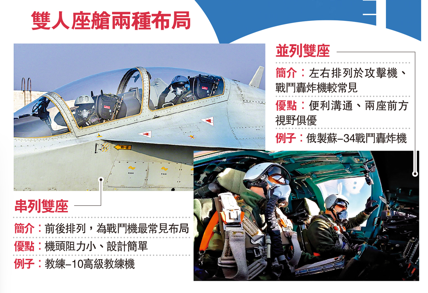 解放軍的戰機中,串列雙座版主要包括三類。一類是教練機,如教練-8、教練-9、教練-10等。學習階段前期,教練員在前座駕駛演示,學員在後座學習觀摩;後期學員在前座,教練員在後座指導。