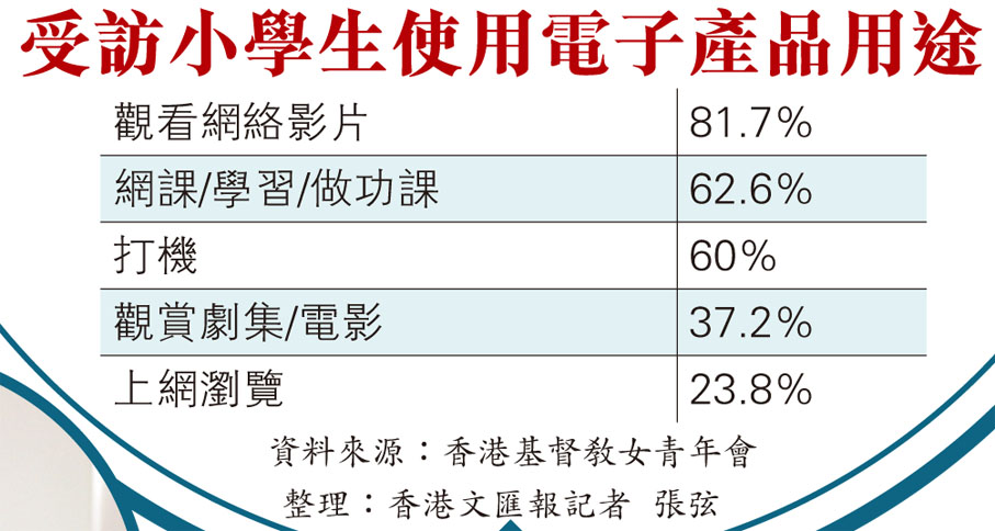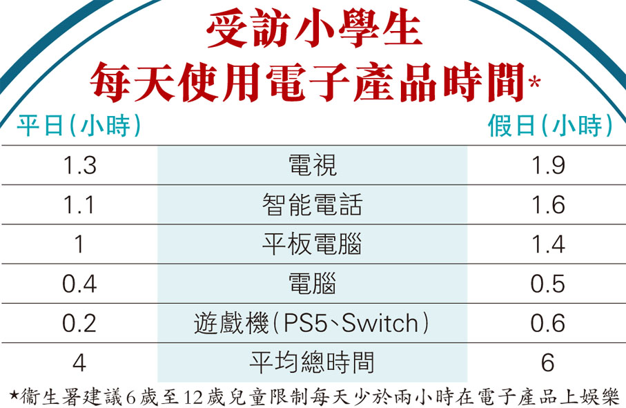 女青於去年7月至10月訪問了773名小學生的父母、祖父母、監護人等,發現在學習用途以外,該些兒童平日平均花4小時使用電視、手機、平板電腦等電子產品,假日使用時間更大增至平均6小時,比家長多出分別一小時至兩個多小時,遠高於衞生署建議,即小學生每天不應花多過兩小時使用電子產品作娛樂用途的指標。