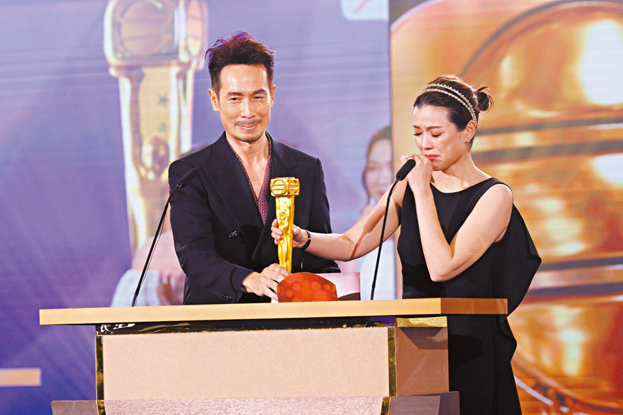 今年頒獎禮戰況激烈,陳豪(阿Mo)憑《破毒強人》「毒王」文華一角成為視帝,曾提名28次視帝的陳豪,今次是繼2007年憑《溏心風暴》再一次稱帝,並在太太陳茵媺(Aimee)手上接過獎項,不過Aimee比老公還要激動,在台上哭成淚人,阿Mo致詞完後,兩人即來個擁抱。